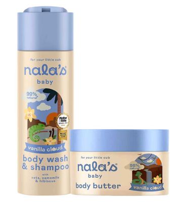 Introduce your little cub to the gentle care of Nala's Baby Vanilla Cloud Skincare Duo. This bundle contains two essential products designed specifically for delicate infant skin. Both the wash and the butter carry the soft, comforting Vanilla Cloud fragrance for a soothing experience.