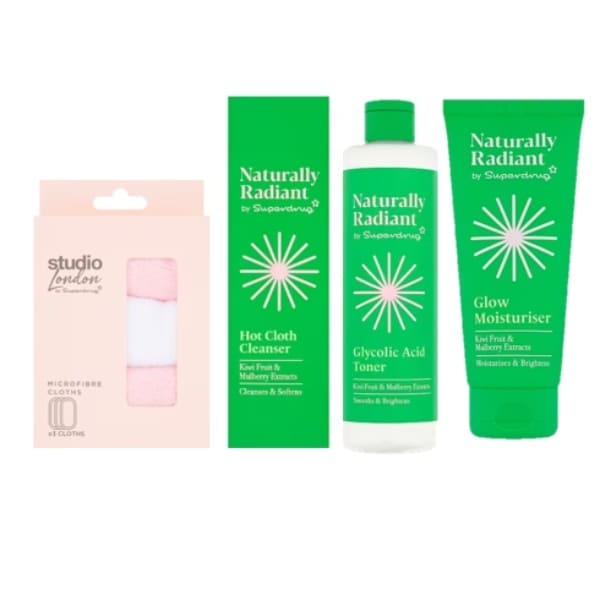 Included in this bundle: Naturally Radiant Glow Moisturiser 100ml, Naturally Radiant Glycolic Toner 300ml, Superdrug Studio Microfibre Cloths 3pk, and Naturally Radiant Hot Cloth Cleanser 150ml
