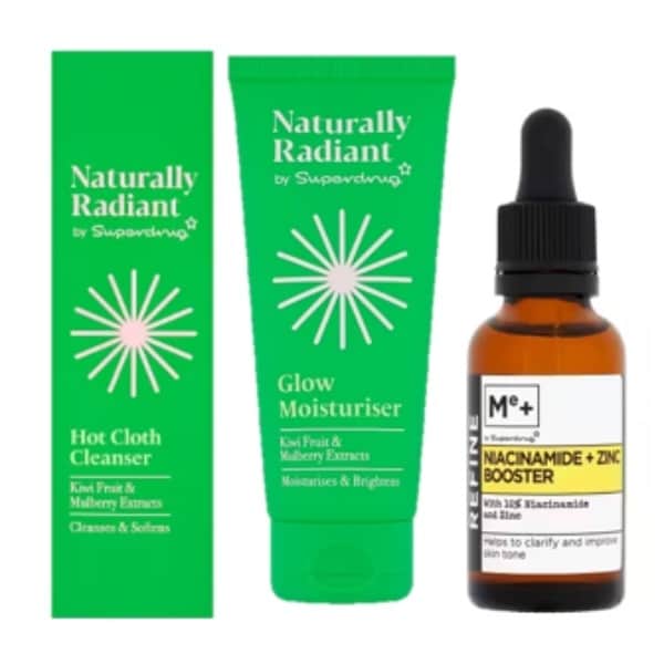 included in this bundle me niacinamide zinc booster 30ml naturally radiant glow moisturiser 100ml and naturally radiant hot cloth cleanser 150ml