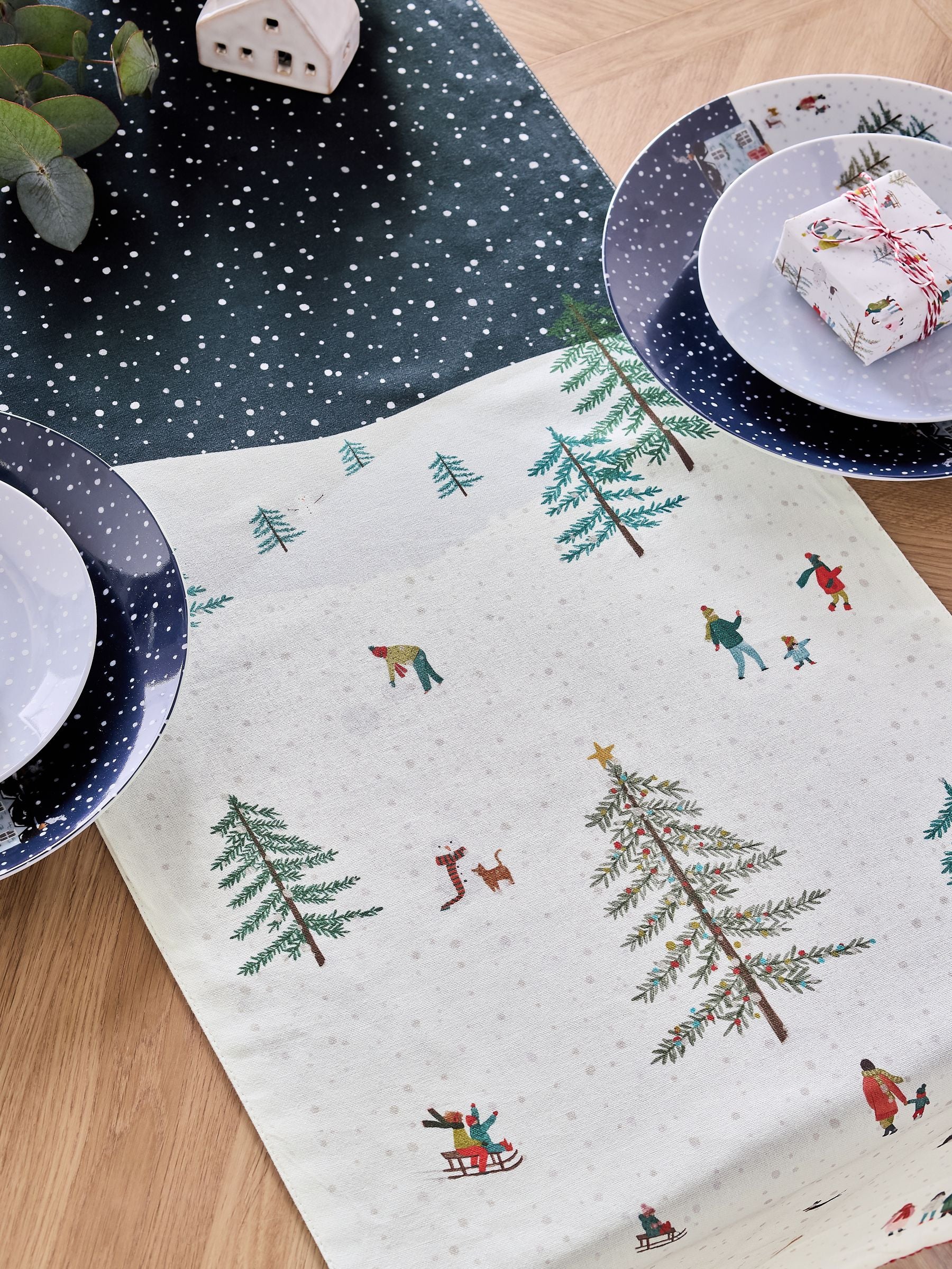 Add some Christmas magic to your dining table with this beautiful hand-drawn Christmas mini scene print table runner. Easy to machine wash, this runner is perfect for any festive event!