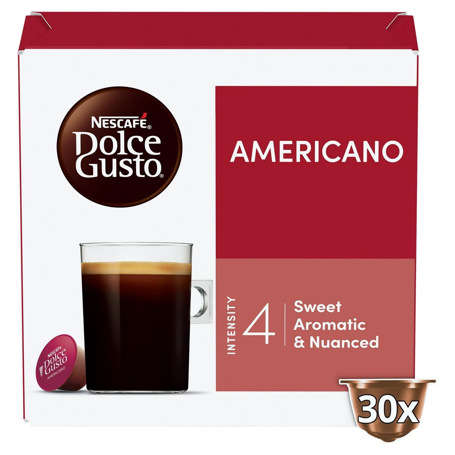These Nescafé Dolce Gusto pods contain roast and ground coffee featuring a sweet, aromatic, and nuanced flavour profile. Intensity level 4 is achieved using a careful selection of Arabica and Robusta beans. Enjoy the convenience of making your preferred coffee shop beverage at home quickly and easily.