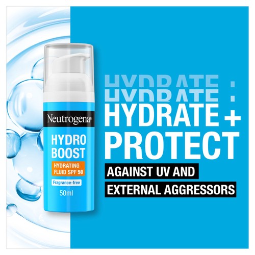 Hydro Boost Hydrating Fluid SPF 50 with Hyaluronic Acid & + Pro-Vitamin B5 &+ 2% Niacinamide, delivering protection against UV & all day hydration to boost the skins vital hydration and maintain the skins dynamic barrier. This lightweight, fast-absorbing, invisible finish SPF 50 gives clinically proven all day hydration and provides high protection against UVA, UVB and long-UVA rays.