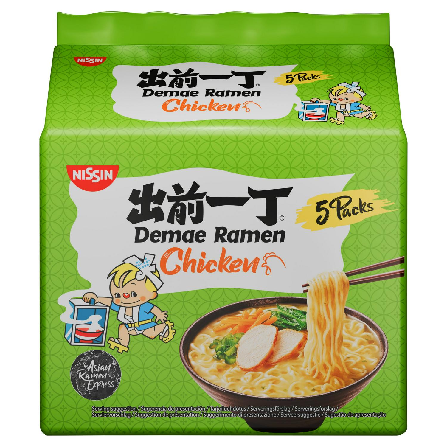 Soup with Instant Noodles Asian Style, Chicken Flavour. Now in a 5 noodle pack. Nissin Demae Ramen Chicken is a culinary classic that has made its way from the kitchens of Asia to every corner of the world. Meticulously selected ingredients like chicken, leek, and toasted sesame oil, paired with tasty ramen noodles make Nissin Demae Ramen Chicken Noodles an authentic Asian treat that delights ramen and noodle lovers around the world. Simply put the noodles in 500ml of boiling water in a pot and cook for 3 minutes. Then remove from heat, add the sachets of seasoning and oil, and stir well before tucking in. This is Asian Ramen Express, always true to our motto: Instantly Prepared, Instantly Delicious! Now available as a multipack. Why not try the rest of our super tasty, super delicious Nissin range? With Demae Ramen Spicy, Beef, Japanese Curry, and Sesame, as well as Nissin Soba noodles, Soba Instant Noodle Pots and Cup Noodles Instant Noodle Pots.