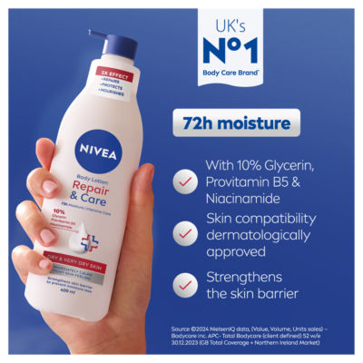 Product InformationNIVEA Repair & Care Lotion transforms and strengthens your skin barrier. It's skin compatibility has been approved dermatologically. With its 3x effect - repairs, protects and nourishes - it provides the care your skin need. The lotion contains a 10% complex of Glycerin, Provitamin B5 and Niacinamide which instantly calms itchy skin feeling and provides a healthy look. NIVEA Repair & Care intensive lotion is perfect for dry & very dry skin as it provides 72h moisture. Non greasy and quick absorbing. For the best results, we recommend to apply this body lotion daily to your whole body. NIVEA cares for your skin. New improved bottle with reduced plastic vs. before / 50% recycled plastic bottle (without cap). Present in over 160 countries, NIVEA is the world's no.1 skin care brand* with more than 100 years of experience. A market leader in the global skincare industry, we use our expertise to carefully select the highest quality ingredients and provide skin compatible, dermatologically approved products to suit various skin types and skin needs. *Source: Euromonitor International Limited, NIVEA in the category Body Care; retail value RSP, 2022 data