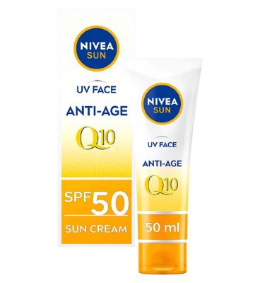 Read MoreNIVEA SUN UV Face Anti-Age Q10 Cream is specially developed for delicate facial skin. This sunscreen protects healthy skin from the OUTSIDE against UVA/UVB rays and from High Energy Visible Light effects such as premature skin ageing. It also protects the skin from the INSIDE thanks to a powerful natural antioxidant that activates the skin's own defence mechanism. This formula with Q10 prevents and fights the appearance of sun induced fine lines, wrinkles and pigment spots.