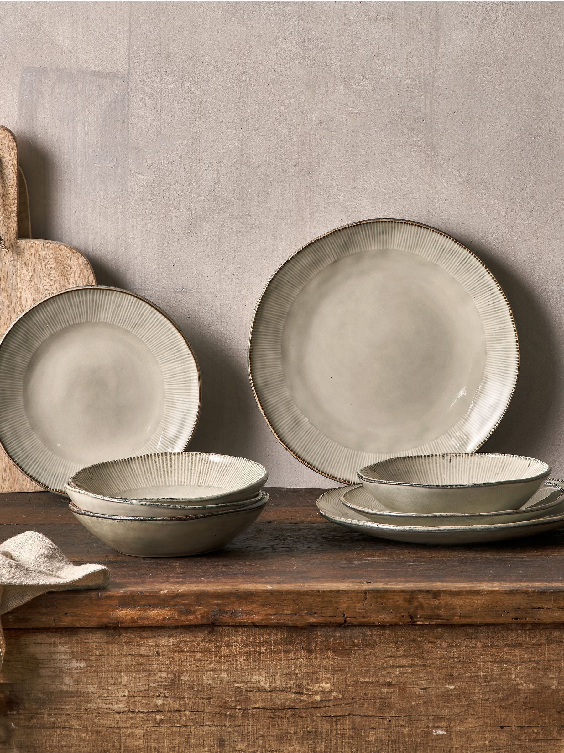 Refresh your table with the soft, natural tones of the Malia dining collection. This 12-piece ceramic set includes everything you need for four place settings—four dinner plates, four side plates, and four bowls.