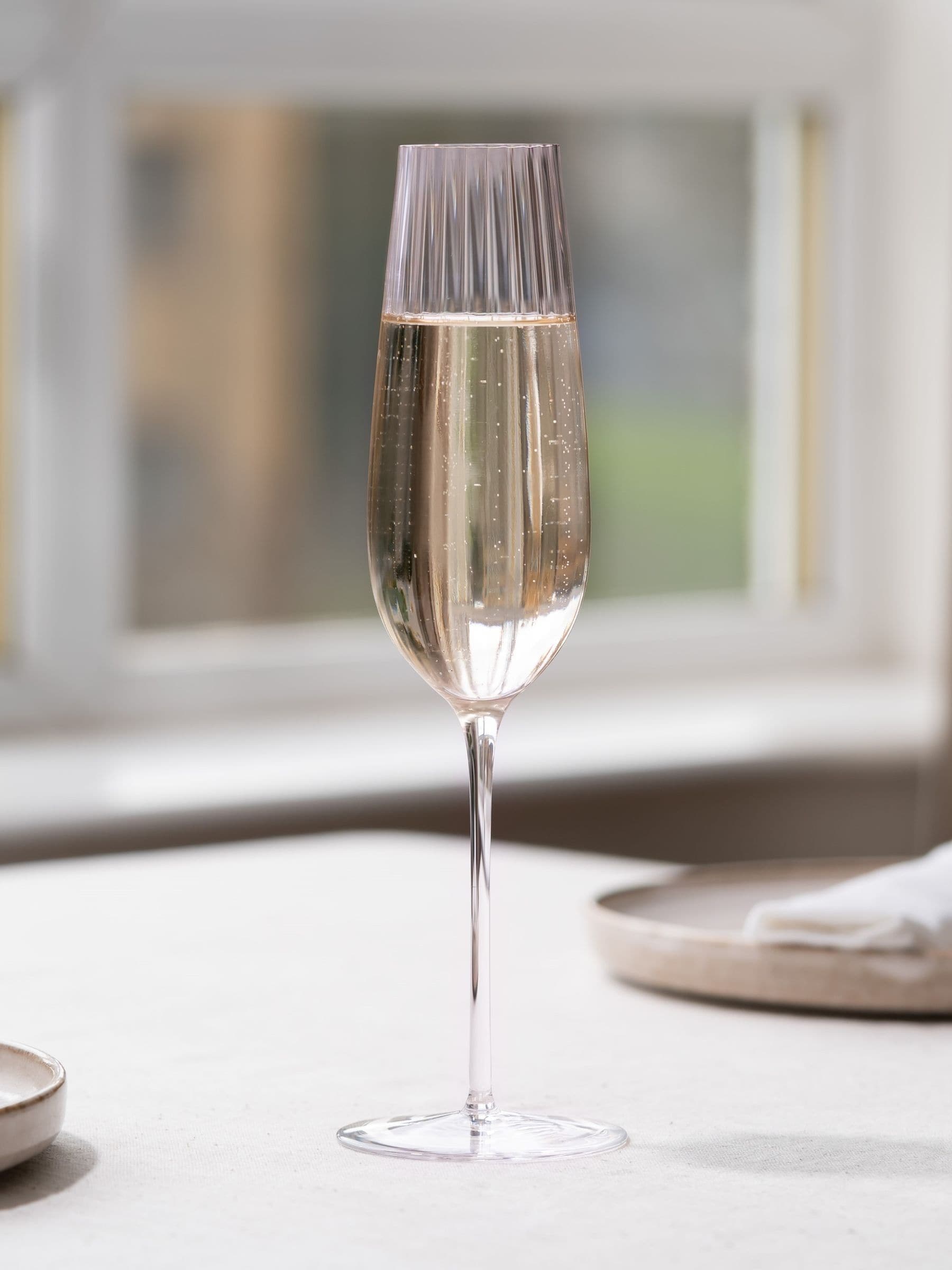This flute glass is a must-have for the lovers of fizz. Part of the NUDE Round Up collection; the Round Up Dusty Rose Sparkling wine glasses are handcrafted for delicacy and precision. These flutes help maintain the finer notes of your favorite bubbles with a specially designed rounded-bottom form. The optic texture enhances the brilliance of the lead-free crystal, illuminating its beautiful dusty rose hue. Toast with sophistication. Also available in the same range are red and white wine options.