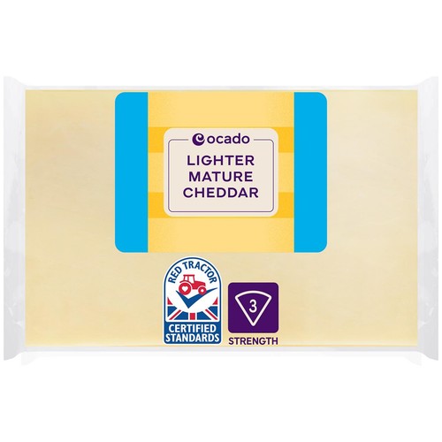 Read MoreOcado Lighter Mature Cheese. Reduced fat Cheddar cheese made with pasteurised milk. Strength - 3 Made at an award-winning creamery, our Red Tractor-certified cheese has 30% less fat than our standard cheddar, but retains the flavour of a mature cheddar. It has a smooth texture and deliciously tangy flavour, perfect for pies, pasties, scones and toasties. Got any lovely leftovers? There’s no need to worry about waste if you have extra cheese that needs using up, simply scroll down for our quick and easy Creamy Cheese and Onion Soup recipe. Whether you're looking for hard, soft, British or Continental, we've got choices galore in our Ocado range, simply search for 'Ocado cheese'.