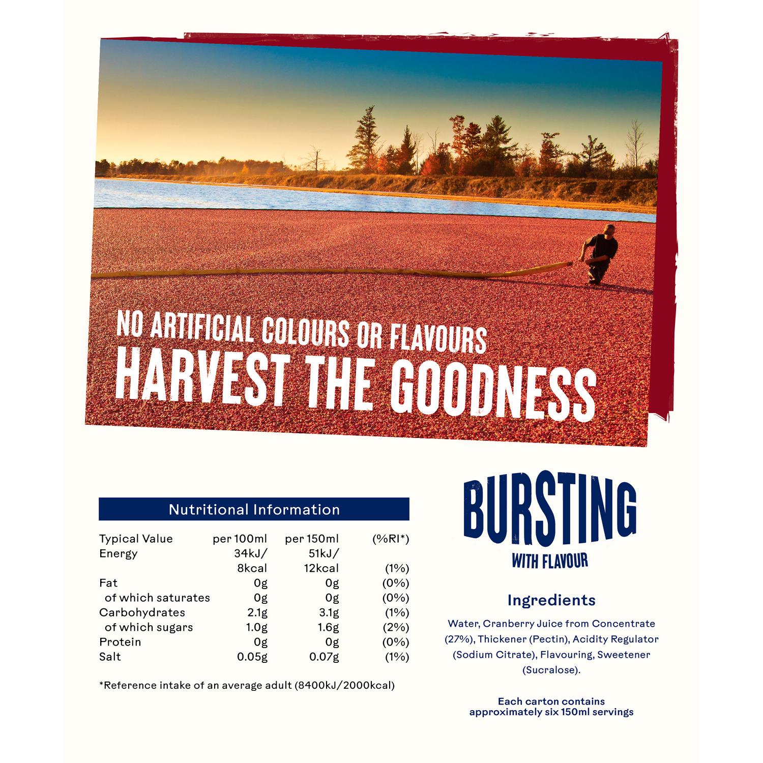 Enjoy the uniquely crisp and clean flavour of this Ocean Spray cranberry juice drink, now formulated with sweeteners instead of added sugar. This multipack contains four 1-litre cartons, perfect for stocking up your fridge. We blend only the ripest cranberries to achieve this distinct, refreshing taste.