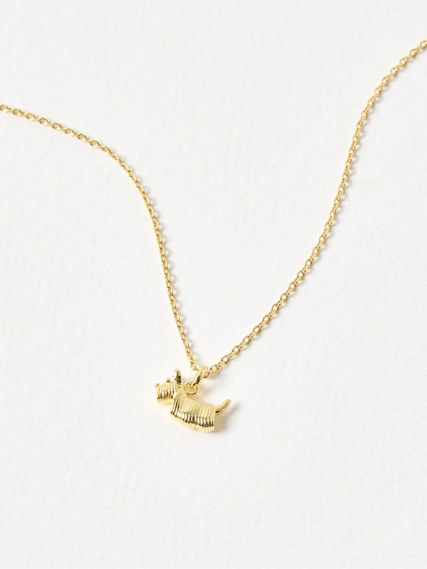 Dainty gold plated necklace with a fine rolo chain, featuring a small Scottie dog charm with a shiny surface finish. The perfect gift for dog lovers and everyday summer looks, layer this dog pendant necklace with other gold necklaces for a textural, personalised finish, and pair with the matching Hamish Dog Stud Earrings for a matching set. Finished with an adjustor chain and three length options to choose from to suit your styling preference.
