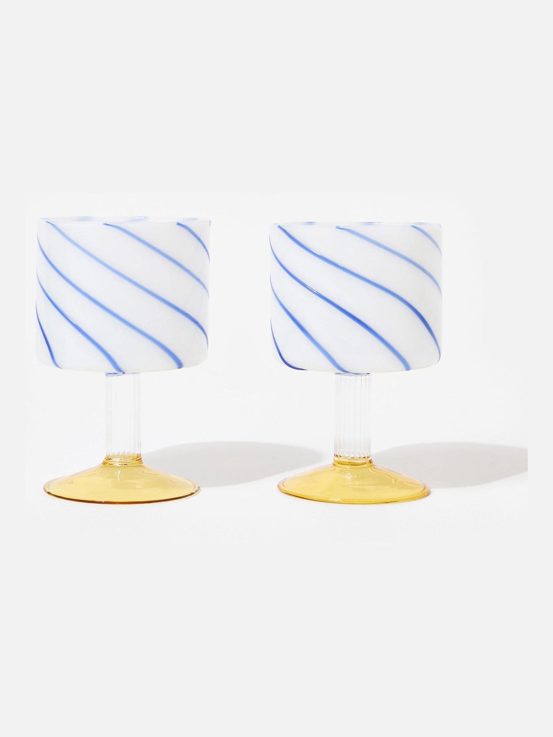These joyful gin glasses feature a bright yellow base and milky white bowl in a square-sided profile, offset by a blue swirl pattern for a bold and bright finish. Add a pop of colour to your summer table and use these multifunctional gin glasses for wine, water, or soft drinks to suit the occasion. Arriving in a custom gift box, this pair of patterned gin glasses would make an ideal housewarming or birthday gift for friends. Size: ONE.