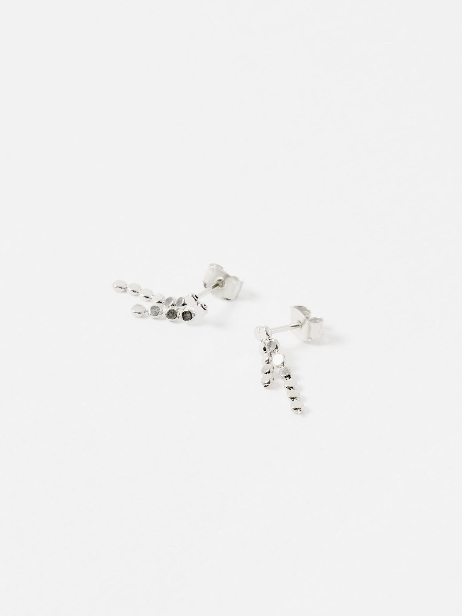 Silver plated drop earrings on a stud back featuring two strands of tiny silver discs on a fine cord chain. Finished to a high shine, these drop earrings are perfect for evening looks and summer partywear, or alternatively can be paired with the matching Demi Silver Plated Necklace and Bracelet to complete the set.