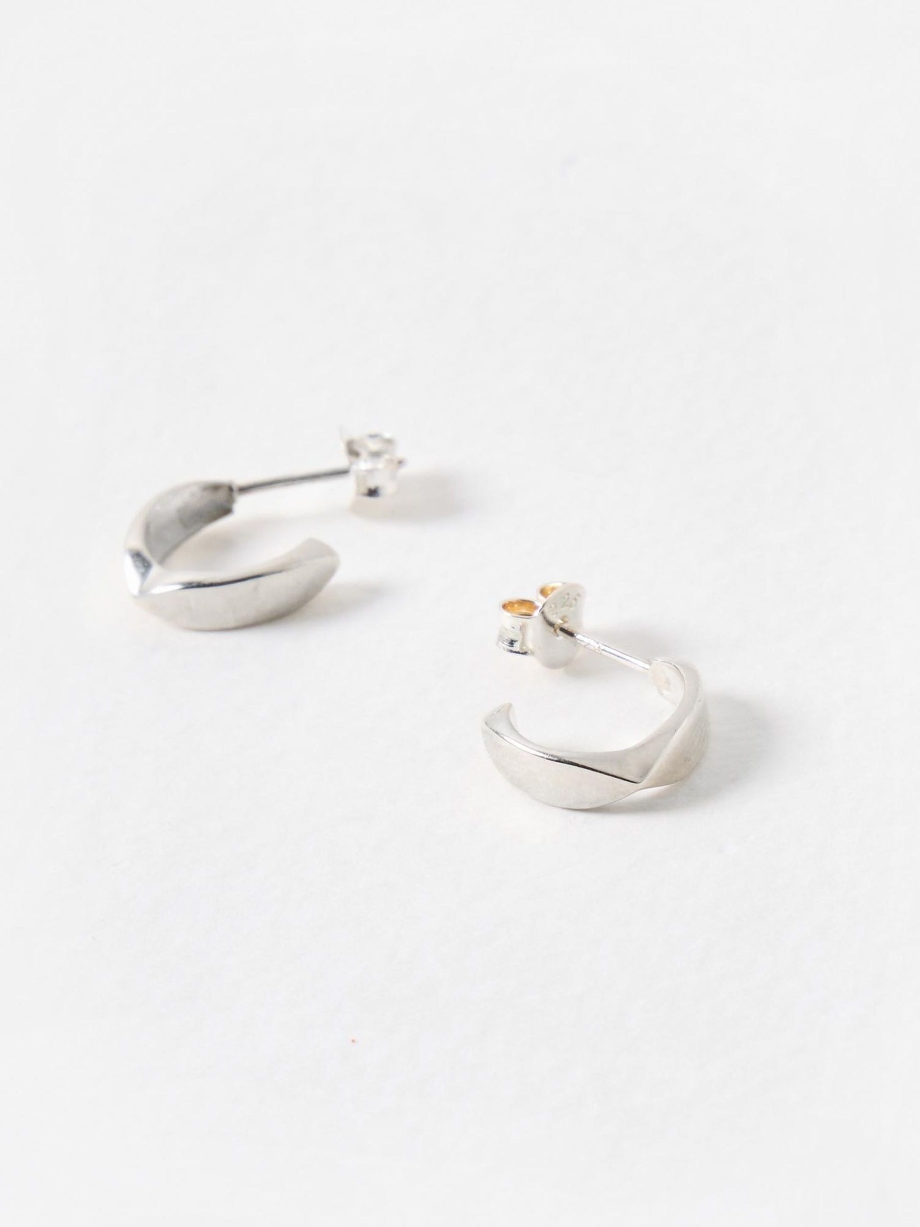 Sterling silver huggie hoop earrings with a stud closure and subtle, faceted surface. Perfect for everyday and workwear, or match with other silver earrings as part of your earring stack.