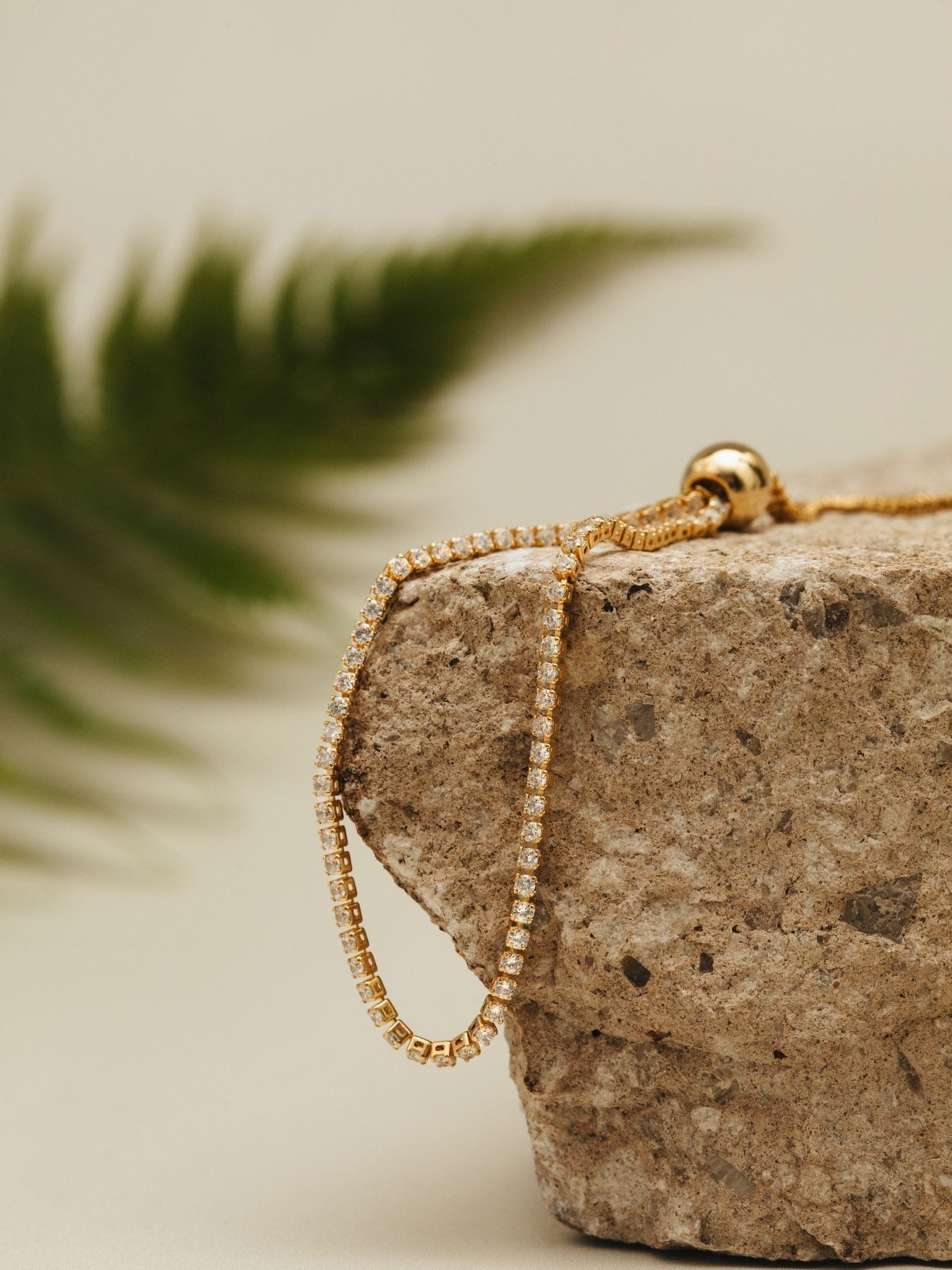 A fine tennis chain bracelet with an adjustable slider fastening. This jewellery is plated in 18k gold.