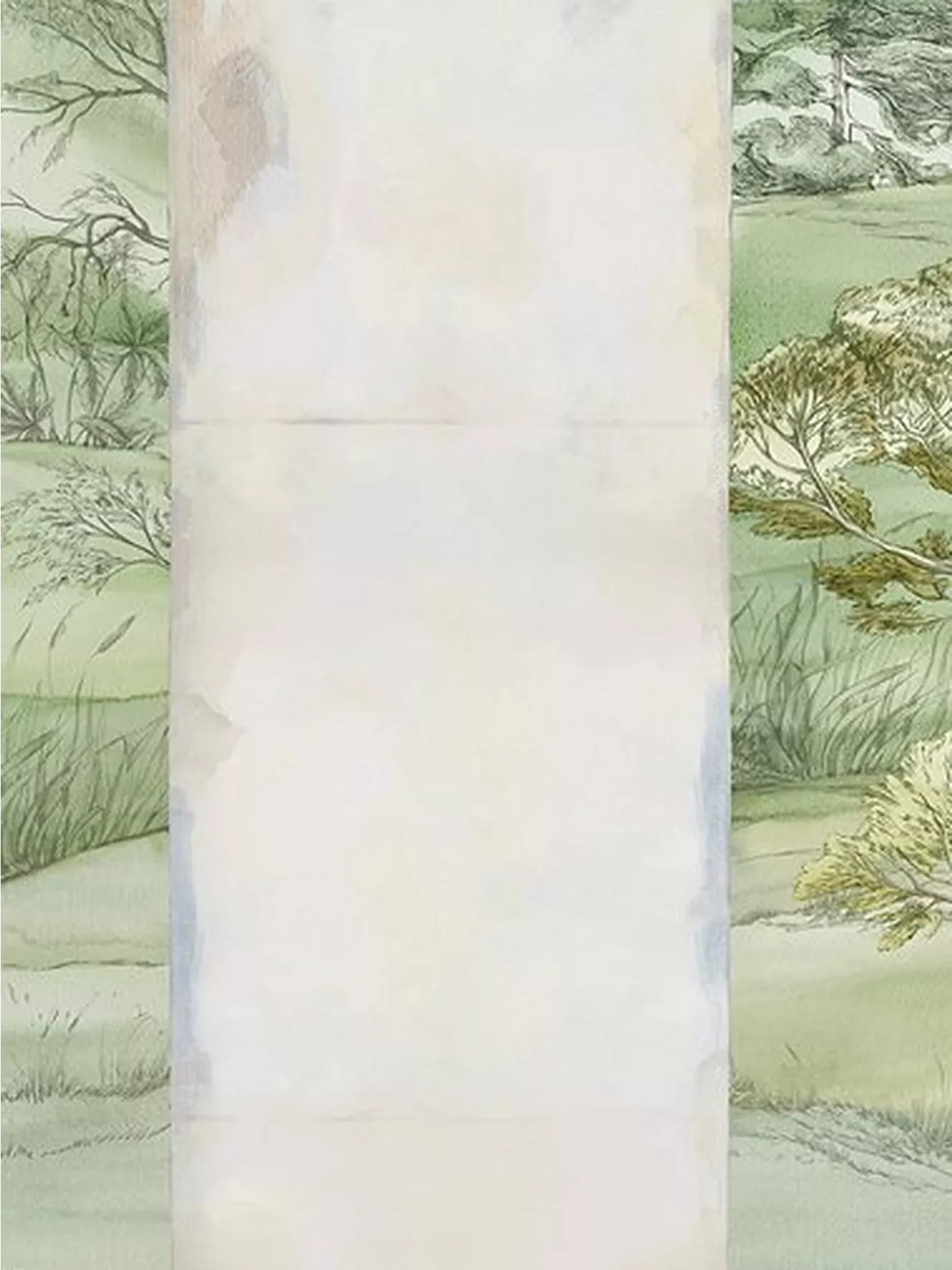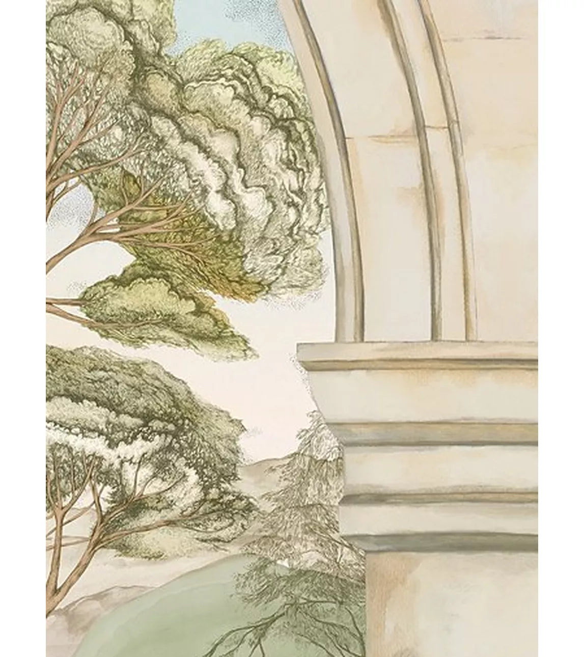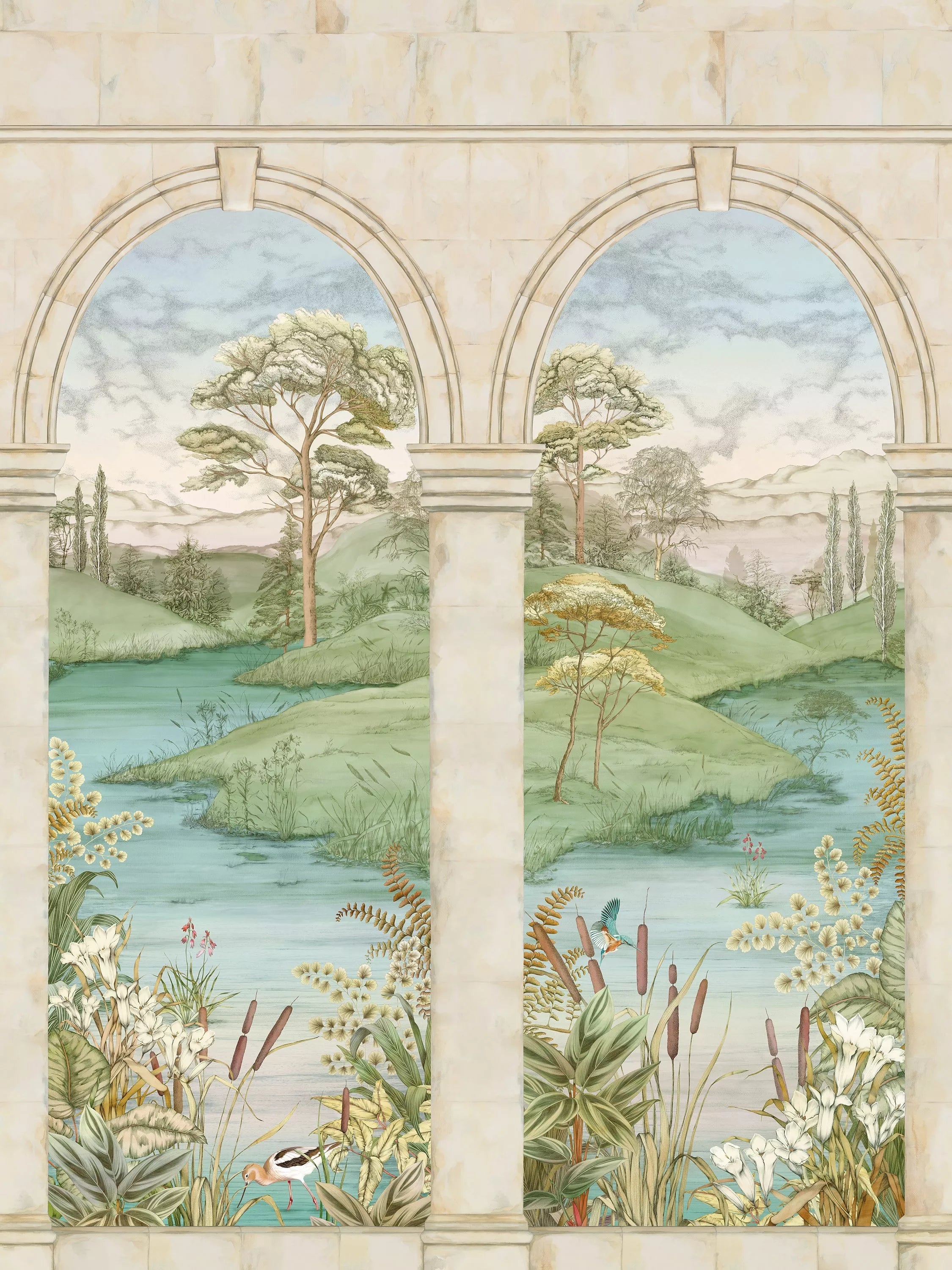 A picturesque lake with bulrushes, water birds and rolling hills beyond is viewed through the archways of a stone colonnade.