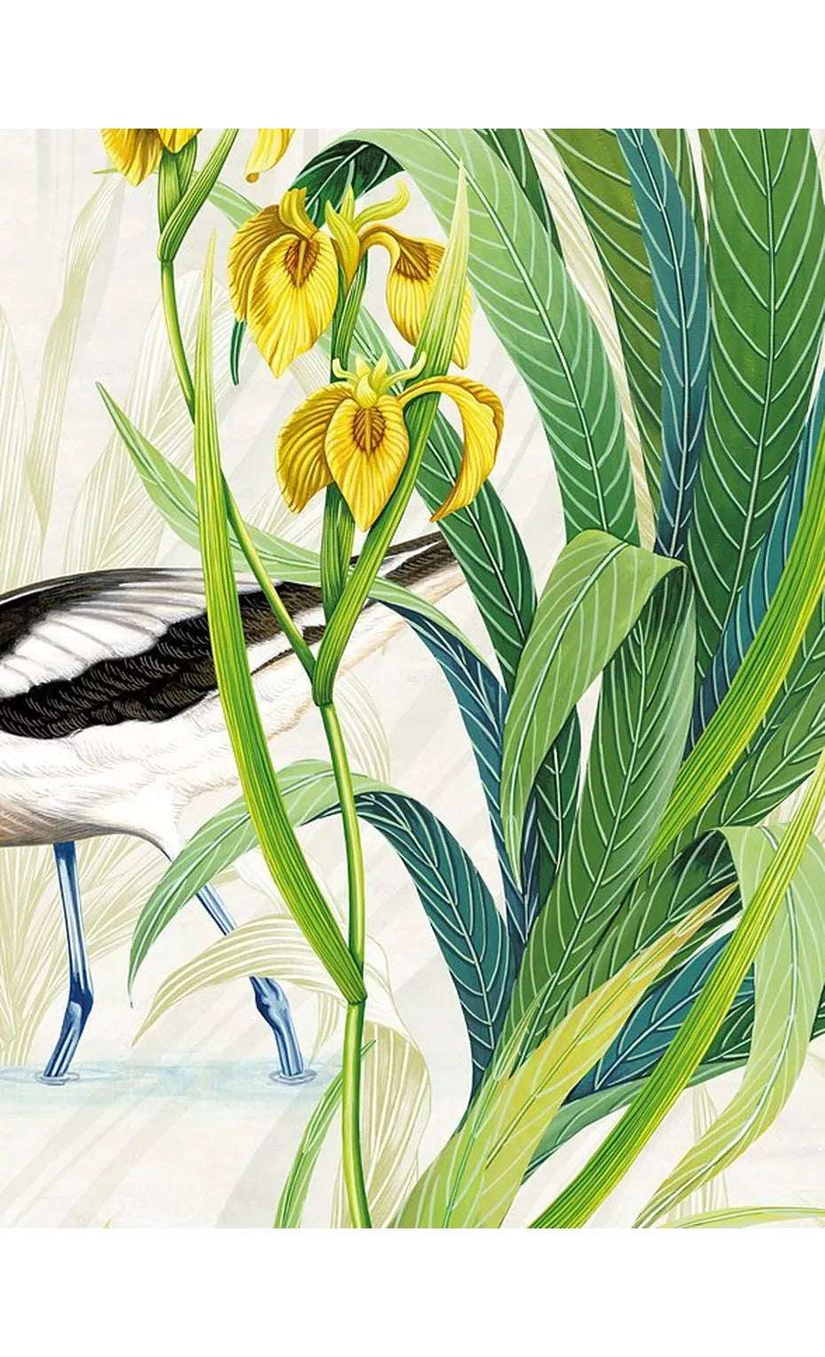 Kingfishers, lapwings and avocets, along with aquatic grasses and water irises, are arranged in a stripe repeat in this tranquil design.