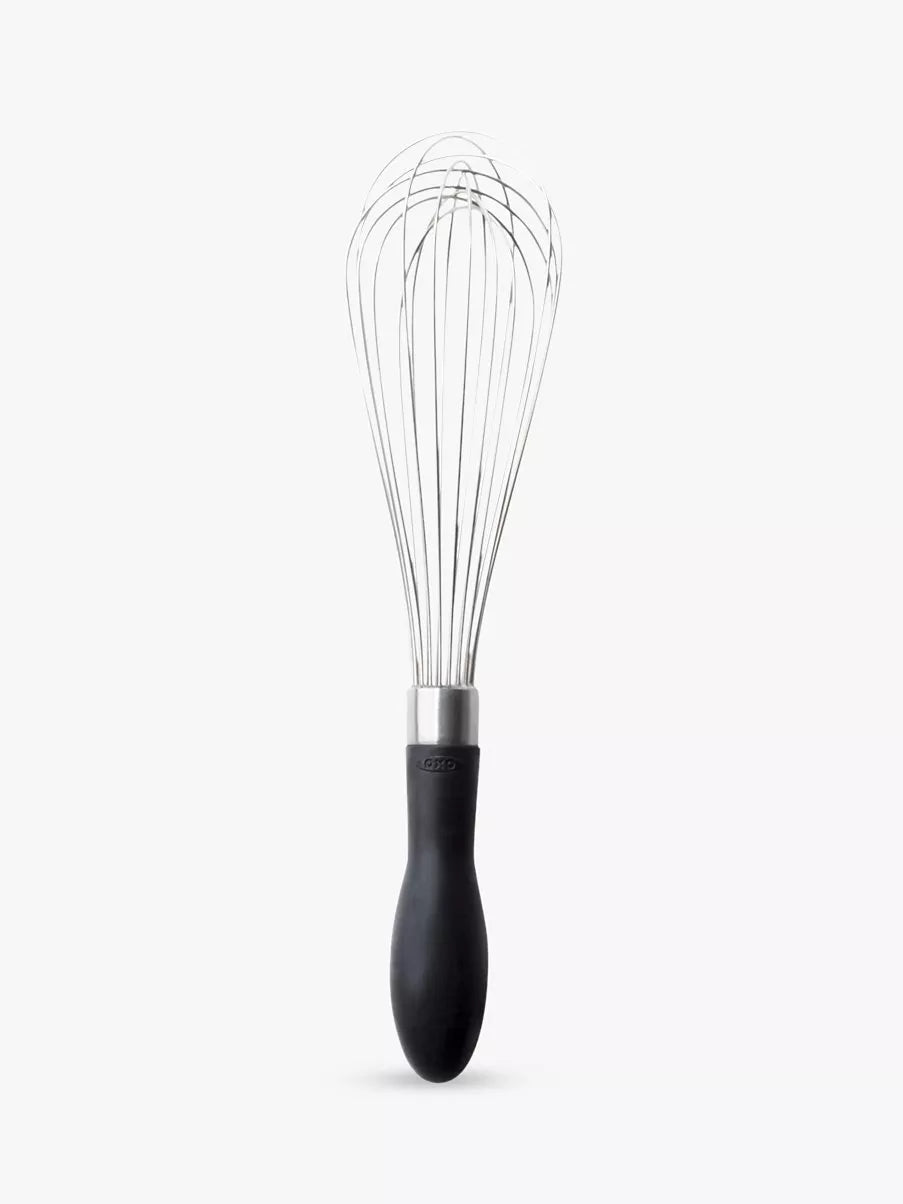 Comfortable and sturdy for vigorous whipping and aerating, the OXO Good Grips Balloon Whisk's shape is ideal for creating maximum fluffiness. Featuring polished stainless steel wires and a teardrop-shaped handle that fits comfortably in the palm of your hand. The soft handle won't slip even with wet hands.