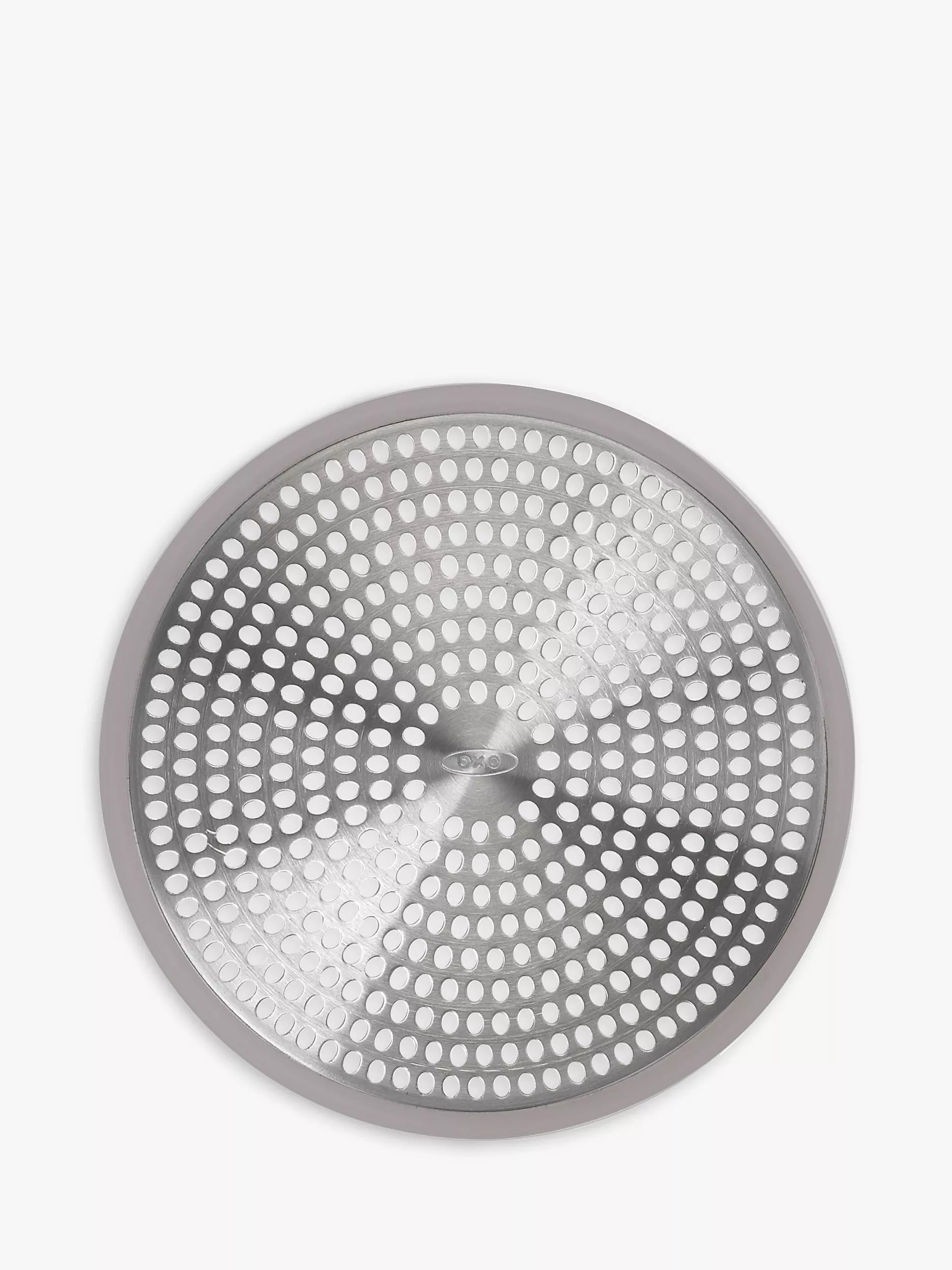 This rust-proof stainless steel drain protector sits flat on shower stall drains so it doesn't get in the way. The hole pattern effectively catches hair without blocking water drainage ad a silicone rim keeps the drain protector in place and prevents it from sliding around.