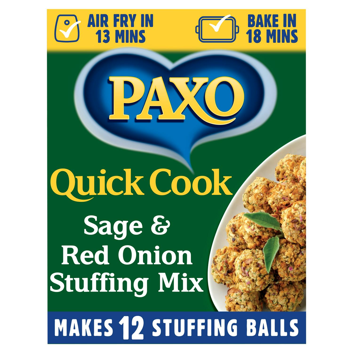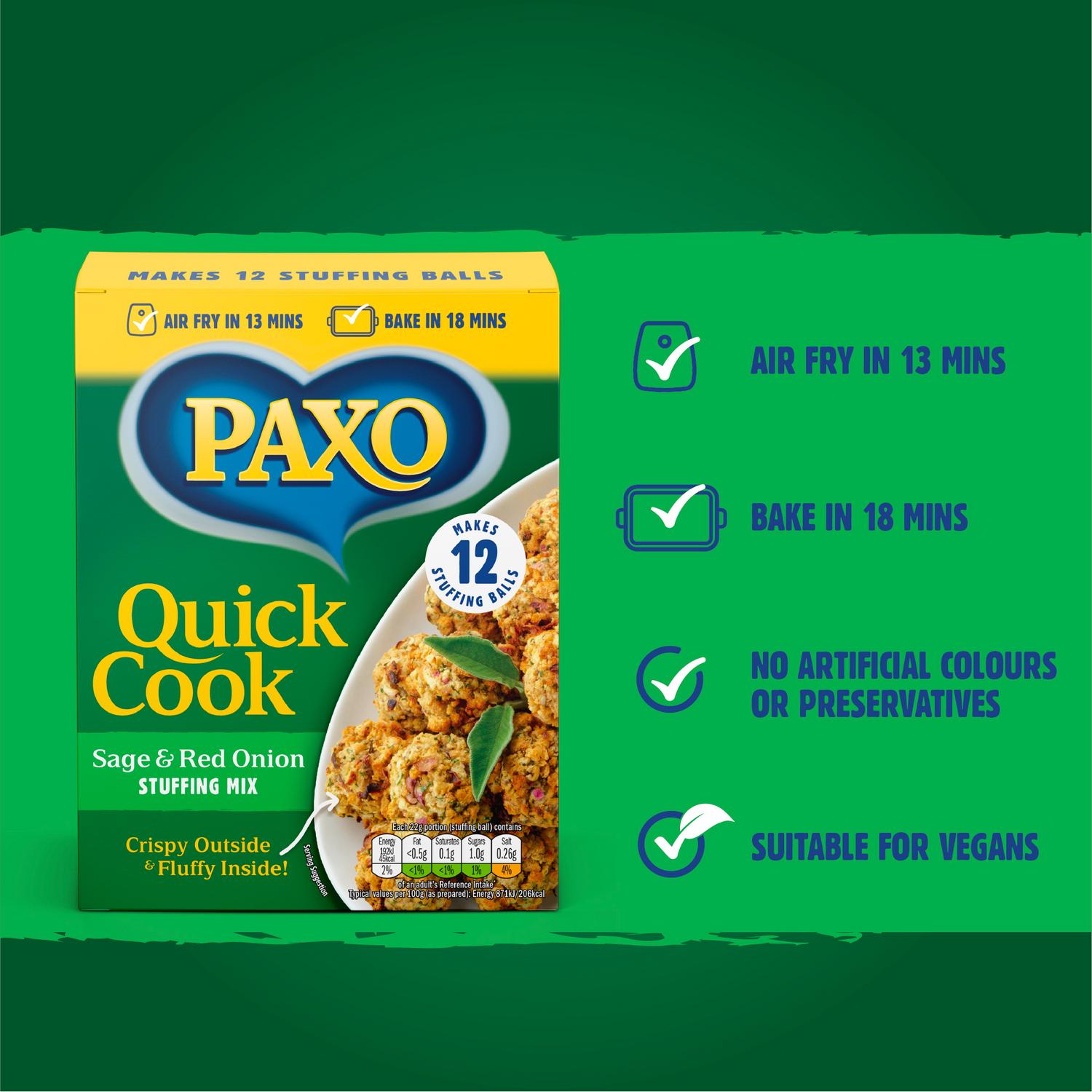 As the UK's No.1 Stuffing Brand* there's so much you can do this holiday season with Paxo Quick Cook Stuffing... Made from our finest ingredients, this hearty stuffing is crispy on the outside and fluffy on the inside, delivering mouth-watering aromas and rich flavours thanks to a blend of tasty herbs and seasonings. It's simple to make - just combine the stuffing mix with boiling water, mix well and leave to stand for three minutes. Form the mixture into approximately 12 stuffing balls, then it is ready to air fry in 13 minutes or bake in 18 minutes. No Christmas roast is truly complete without the perfect finishing touch of the Nation's favourite stuffing! But Paxo also offers a great way to add texture and flavour to all kinds of other dishes. Sprinkle into soups, stews and casseroles to add a delicious flavour and texture. Or try on top of pasta bakes, pork chops, steaks and fish to add a delicious crunch and flavour. Nation's favourite stuffing† † Paxo is the No.1 best selling ambient stuffing brand. Source: Circana, Major Mults, Market Data for Great Britain, 52 weeks up to and including 06/09/2025"