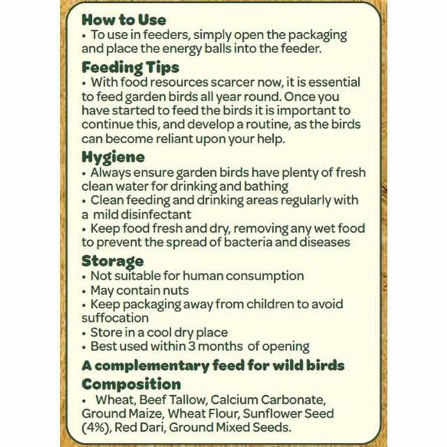 - Use in energy ball feeders, on bird tables and ground feeders.