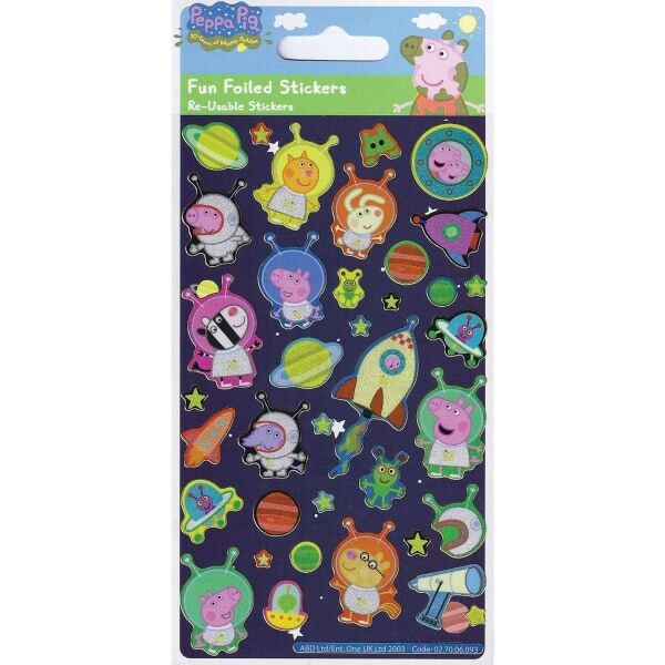 These officially licensed Peppa Pig foil stickers offer vibrant decoration for various craft projects. Featuring space-themed designs, including planets and a space shuttle, these stickers provide lasting quality.