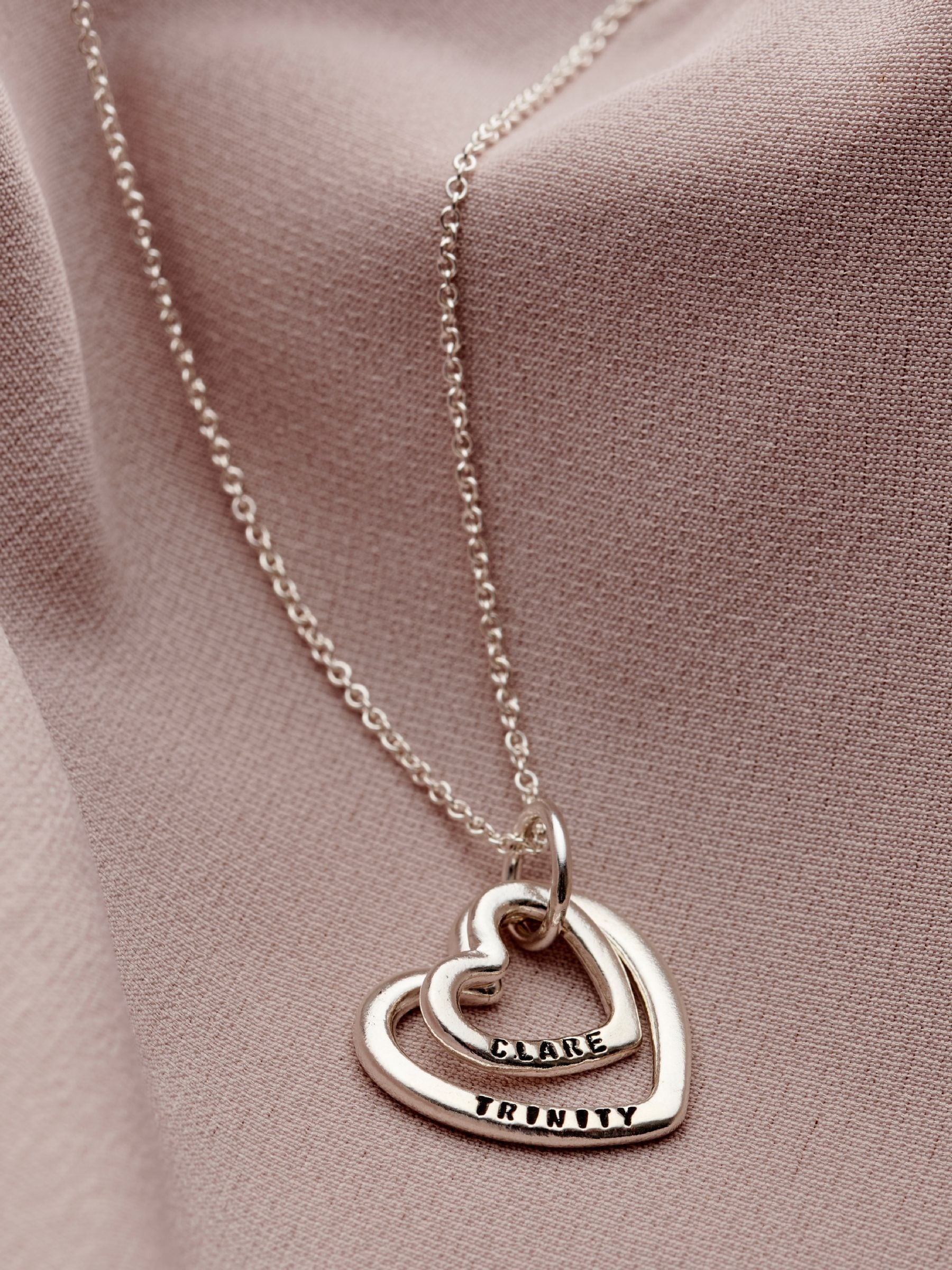 Carry those special names in your heart at all times with this personalised mummy and baby heart necklace. Each heart can be personalised with names, dates or words special to you. Popular personalisations are names of best friends, wedding dates and children names, although you can be as creative as you wish. The large heart can be personalised with up to 10 characters and the small heart with six characters. Choose from a black or clear text finish. Handmade in sterling silver, includes an 18cm chain.