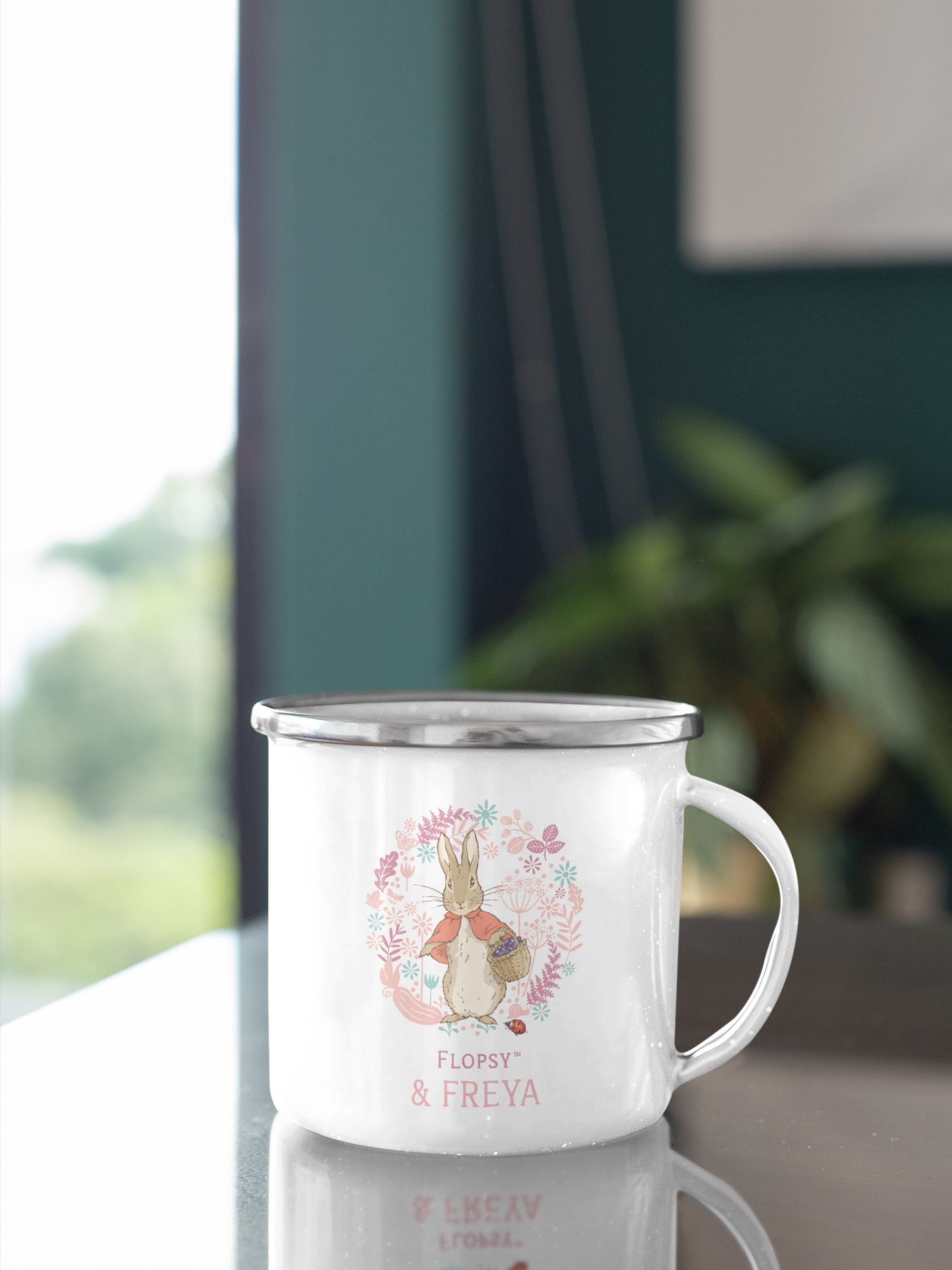 Introducing the Personalised Flopsy & Me Enamel Mug! This extraordinary mug is perfect for fans of Peter Rabbit, providing a touch of nostalgia and whimsy to your morning cup of hot cocoa or tea.