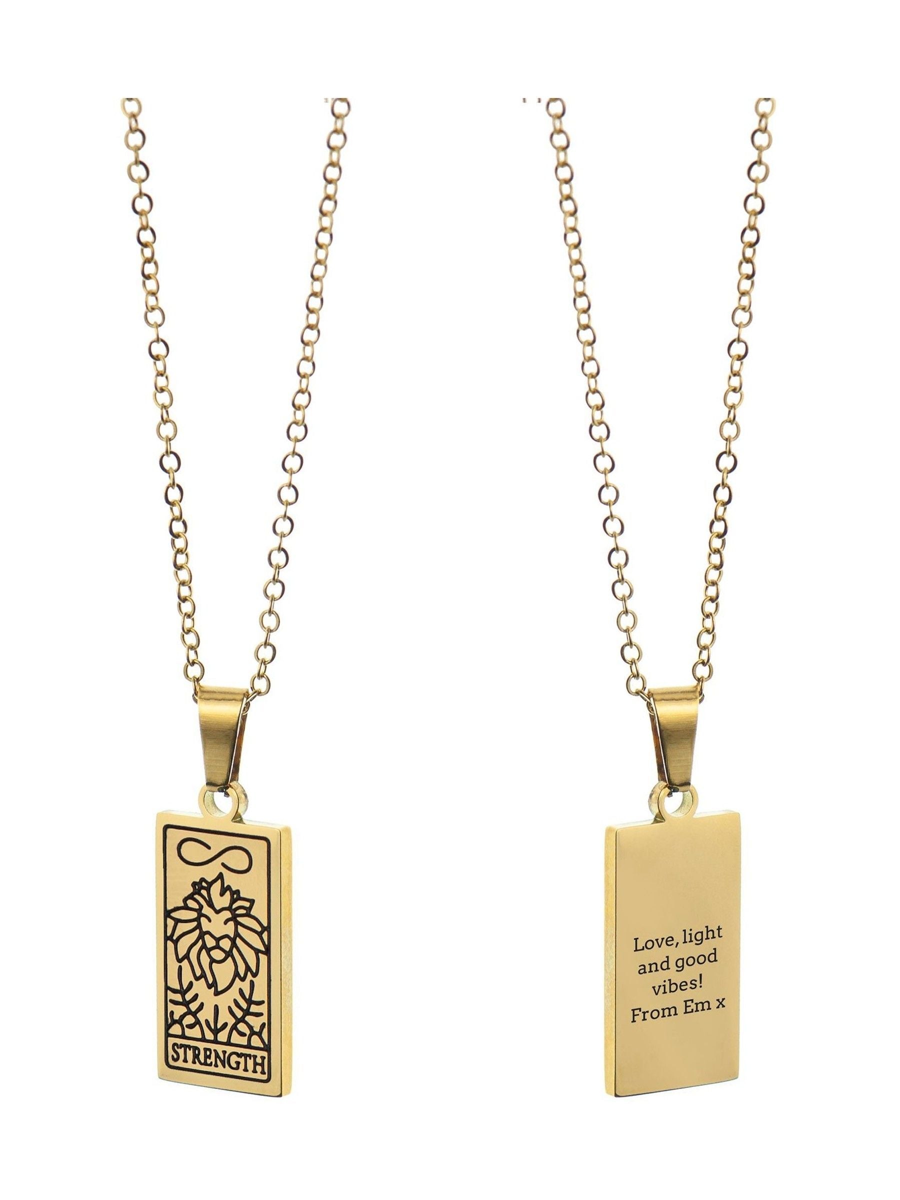 Whether you're giving it as a birthday or Christmas gift, or simply showing your love on Valentine's Day, this necklace is sure to impress. This luxury gold-plated necklace features an engraved Strength tarot card design.