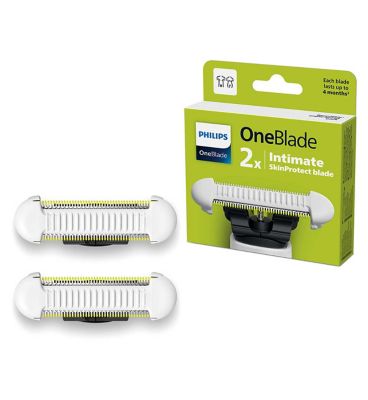 These Philips OneBlade Intimate Replacement Blades come in a convenient 2-pack designed for sensitive skin areas. They feature the innovative SkinProtect blade technology specifically engineered to shield skin from nicks and razor burn. This provides necessary extra protection when performing intimate grooming on delicate parts of the body.