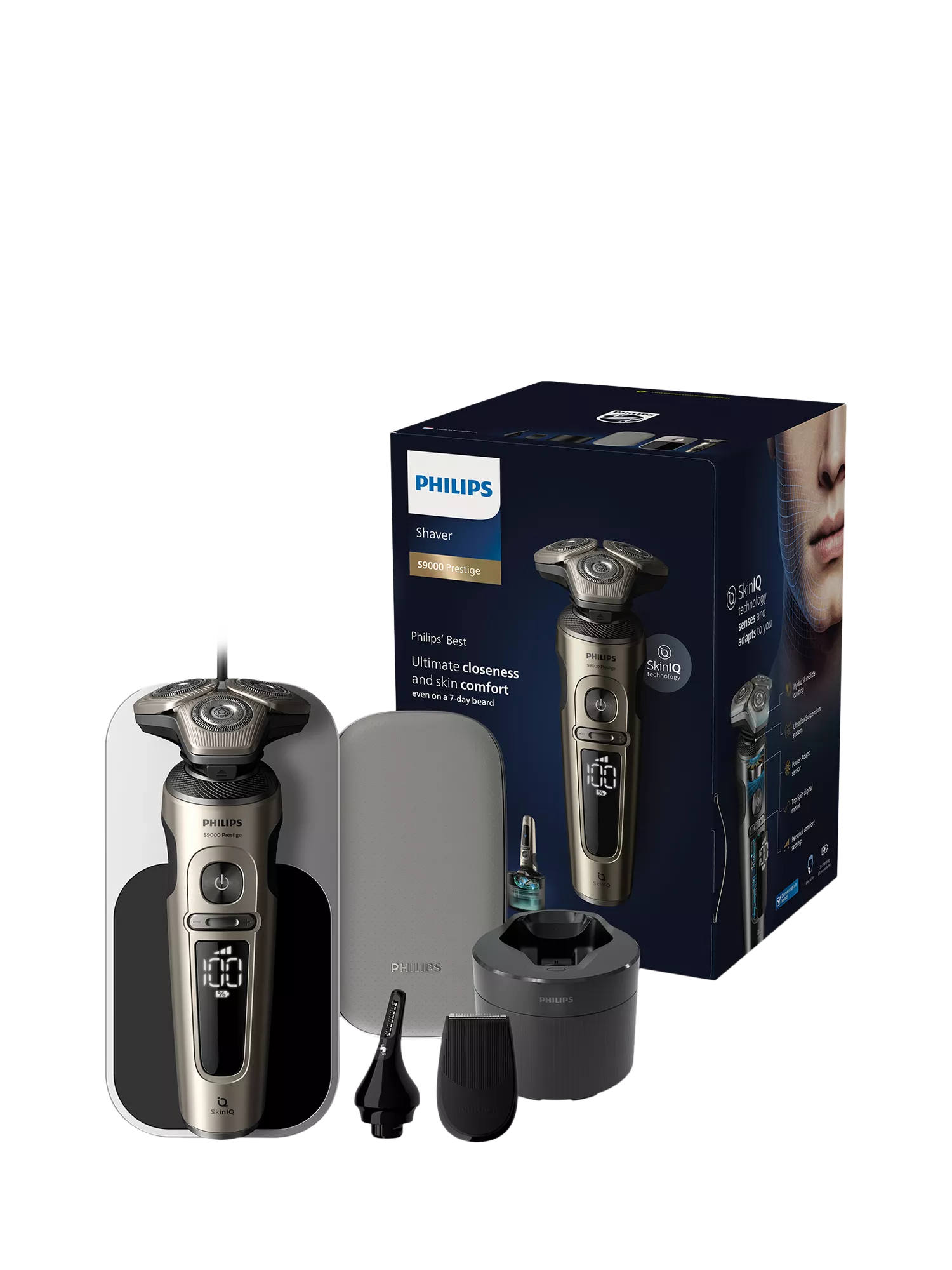 Experience ultimate closeness and skin comfort - even on 7-day beards, with Philips S9000 Prestige. Equipped with SkinIQ technology the shaver senses and adapts to you for the shaving experience you always desired.