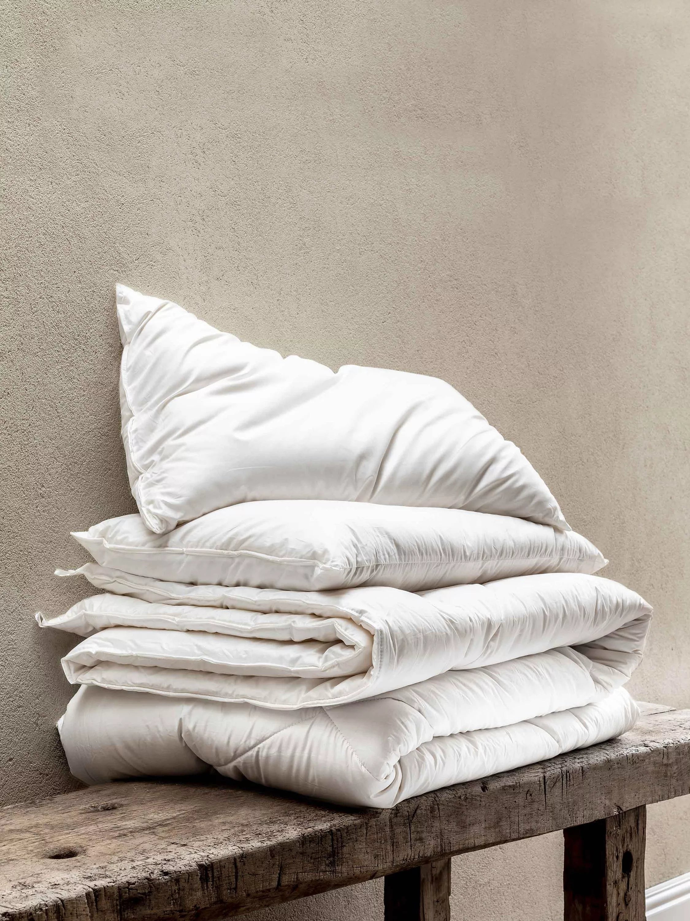 This warmer weight duvet is filled with wool from Merino sheep and it's encased in a 100% organic cotton cover. Made and filled by hand, these materials have been selected to help regulate your temperature for a restful night's sleep. They're also naturally hypoallergenic.