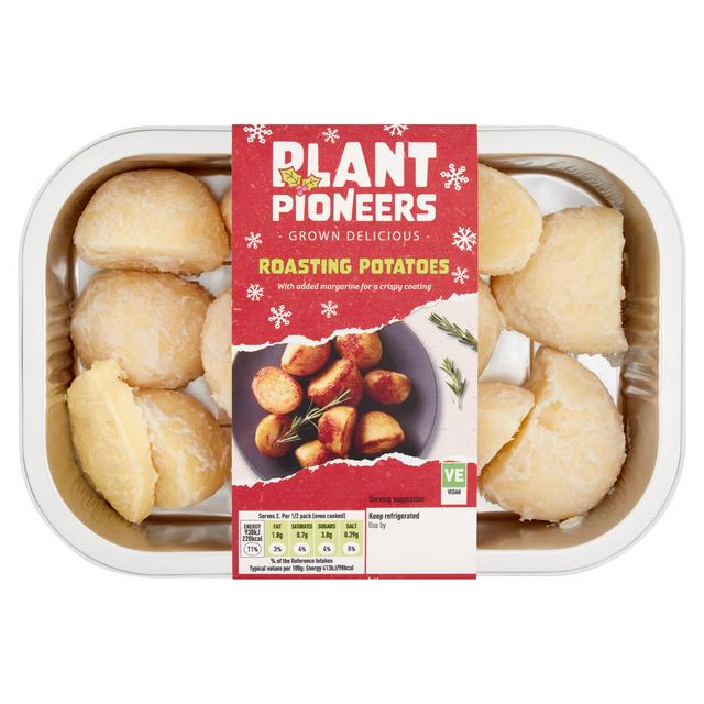 These Plant Pioneers Roast Potatoes provide a convenient side dish for any meal occasion. The potatoes are tumbled in sunflower oil and vegetable margarine, ensuring they are ready for roasting. This 450g pack is specifically formulated to be suitable for vegans, offering a plant-based option for gatherings.