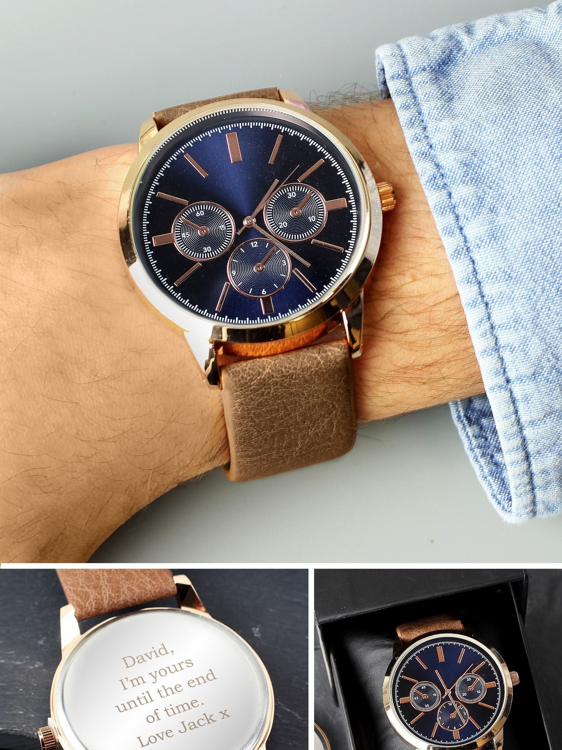 This Stunning Personalised Men s Gold Watch with Brown Strap is the perfect gift to show that special man how much you care. This watch can be personalised with 5 lines of text.