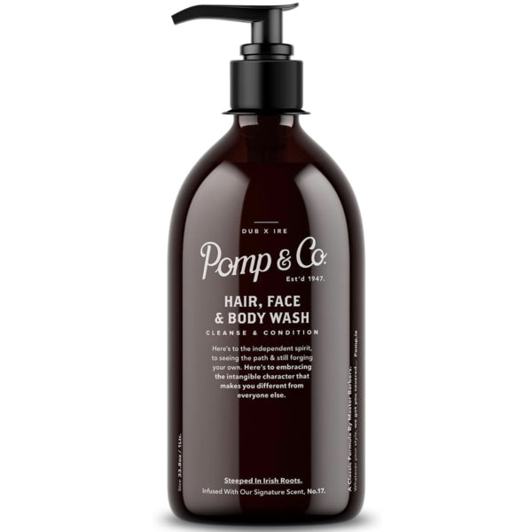Ultimate 3-in-1 Solution: Pomp & Co. Hair, Face, and Body Wash delivers a complete grooming experience with one versatile formula, designed to cleanse and revitalize hair, skin, and body effortlessly. Iconic Signature Scent: Infused with Pomp & Co.'s renowned signature fragrance, this body wash leaves a refined, long-lasting scent for a fresh and sophisticated feel. Enriched with Argan Oil: Infused with nourishing argan oil, this all-in-one wash provides deep hydration, leaving your skin soft and hair manageable after every use. Economical 1-Litre Size: Perfect for daily use, the generous 1-litre bottle ensures long-lasting value and convenience for home, gym, or professional settings. Premium Grooming for Men: Expertly crafted for men, Pomp & Co. offers a high-quality, easy-to-use solution for a modern and effective grooming routine.