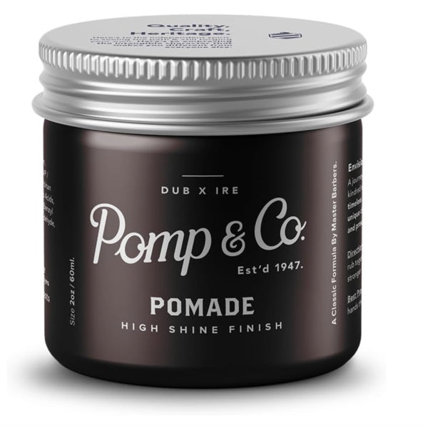 Pomp & Co High Shine Pomade provides a concentrated formula perfect for achieving classic, structured hairstyles. It offers a medium to strong hold depending on the amount applied to your hair. This signature pomade is designed for styles like pomps and slick-backs that require control and polish.