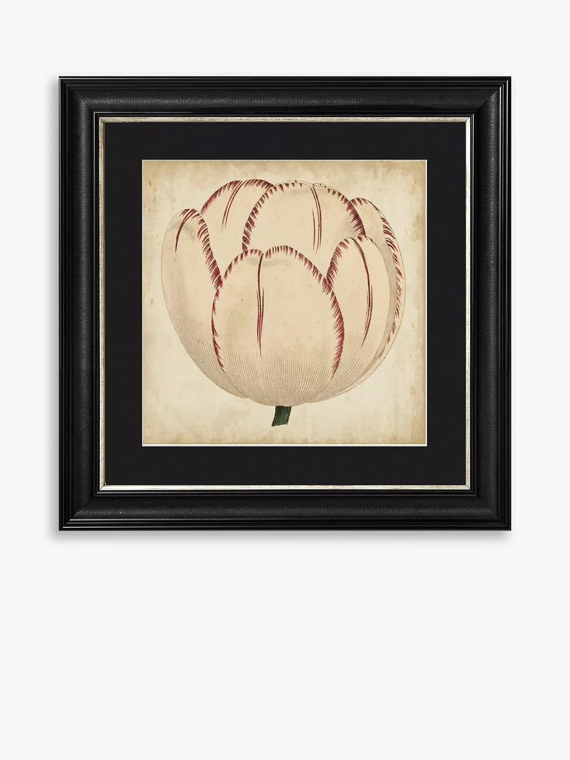 A detailed illustration of a flower, printed on satin photo paper and framed in a black and antique pewter moulding. The frame is made of a recycled wood composite and comes with a black mount and white core.