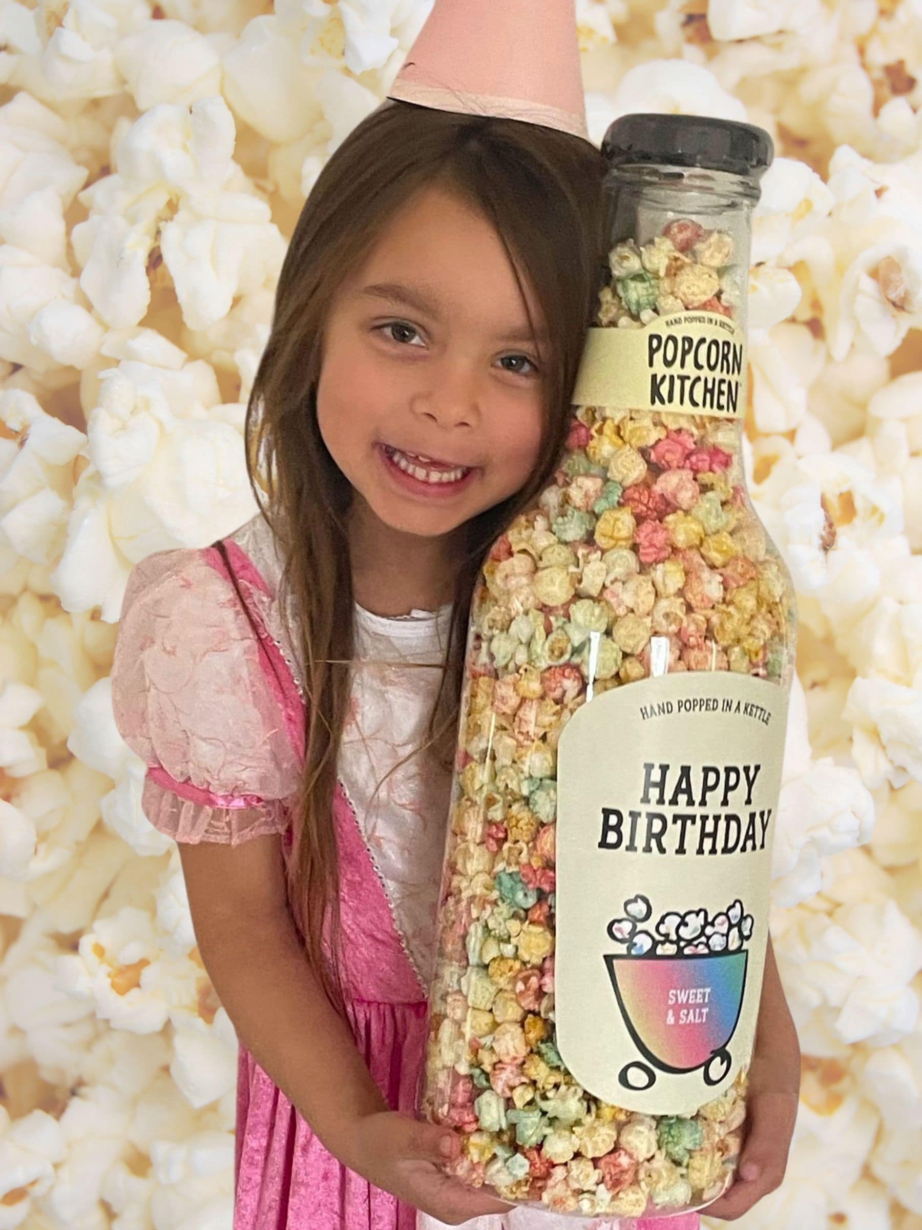 NEW!! Our bestselling Giant Moneybox bottle filled with our classic hand-popped sweet and salt popcorn recipe and natural rainbow colours now celebrating a very HAPPY BIRTHDAY. An old-school favourite that is always a hit with the kids! Once eaten the Giant bottle becomes a moneybox with its coin slot lid. A great gift ! Our Giant bottle is huge Height 51.5cm, Diameter 16cms! 100% Vegan, wholegrain and gluten free.