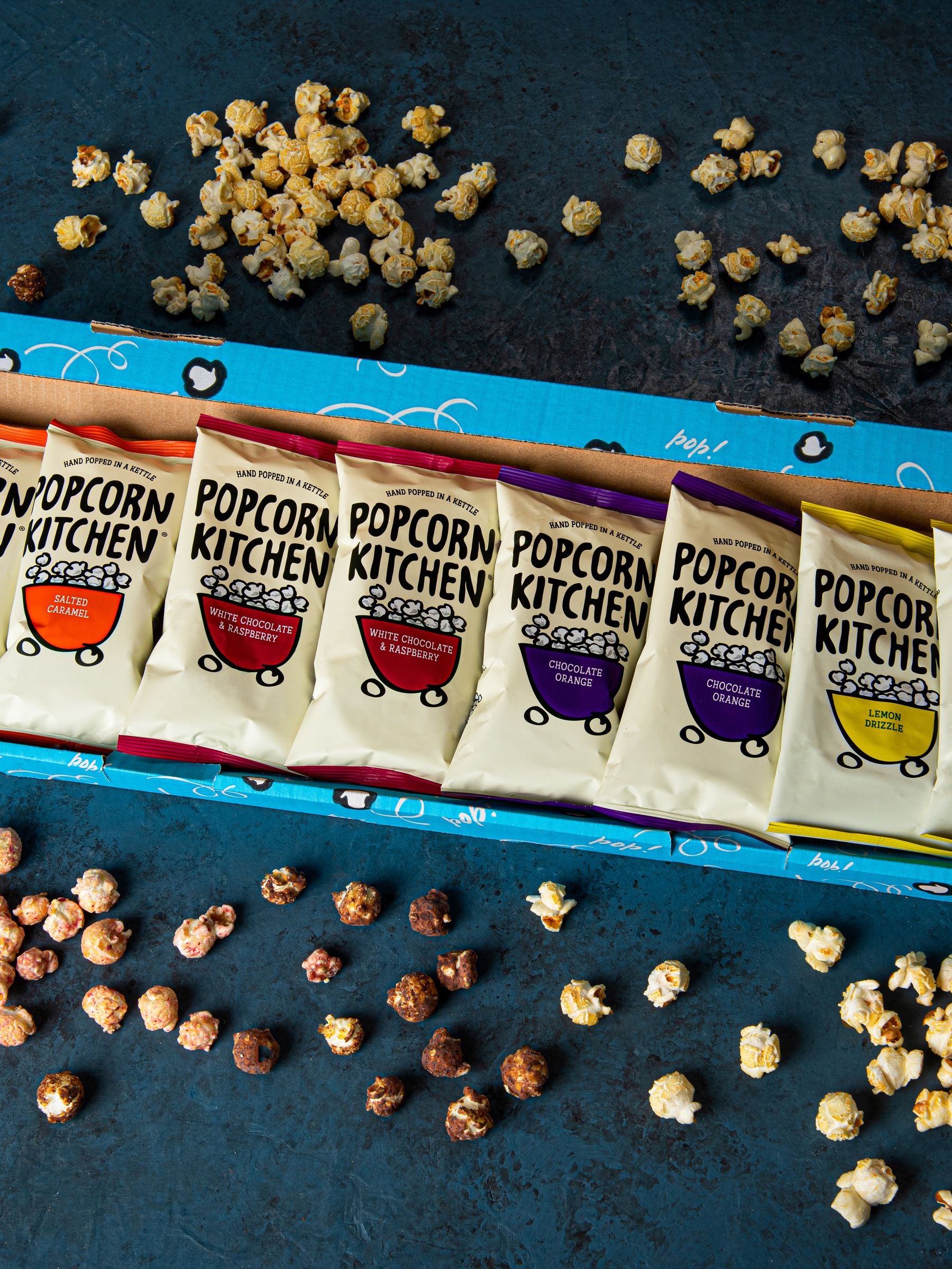 Great Letterbox gift, four of our most indulgent recipes together in a rather natty streamline delivery box, delivering a luxury package of gourmet popcorn to make any snacking aficianado happy! Contains 2 packs of each of the following fantastic recipes: Salted Caramel: We hand-pop our gourmet popcorn and gently tumble into indulgent caramel made with butter, double cream and a sprinkling of sea salt.Chocolate Orange: A classic combination - Belgian chocolate, a zesty orange flavour and our hand-popped gourmet popcorn. Delicious! White Chocolate & Raspberry: Our hand-popped gourmet popcorn smothered in Belgian white chocolate and freeze dried raspberries, what a combination! Lemon Drizzle: One of our newest recipes and fast becoming a favourite! We add a zesty lemon flavour to an indulgent caramel made with butter and cream and generously drizzle over our hand-popped popcorn. Vegetarian. Gluten Free. Wholegrain. GM Free. Pack dimensions Height 20cms x width 62cms x 3 cms.