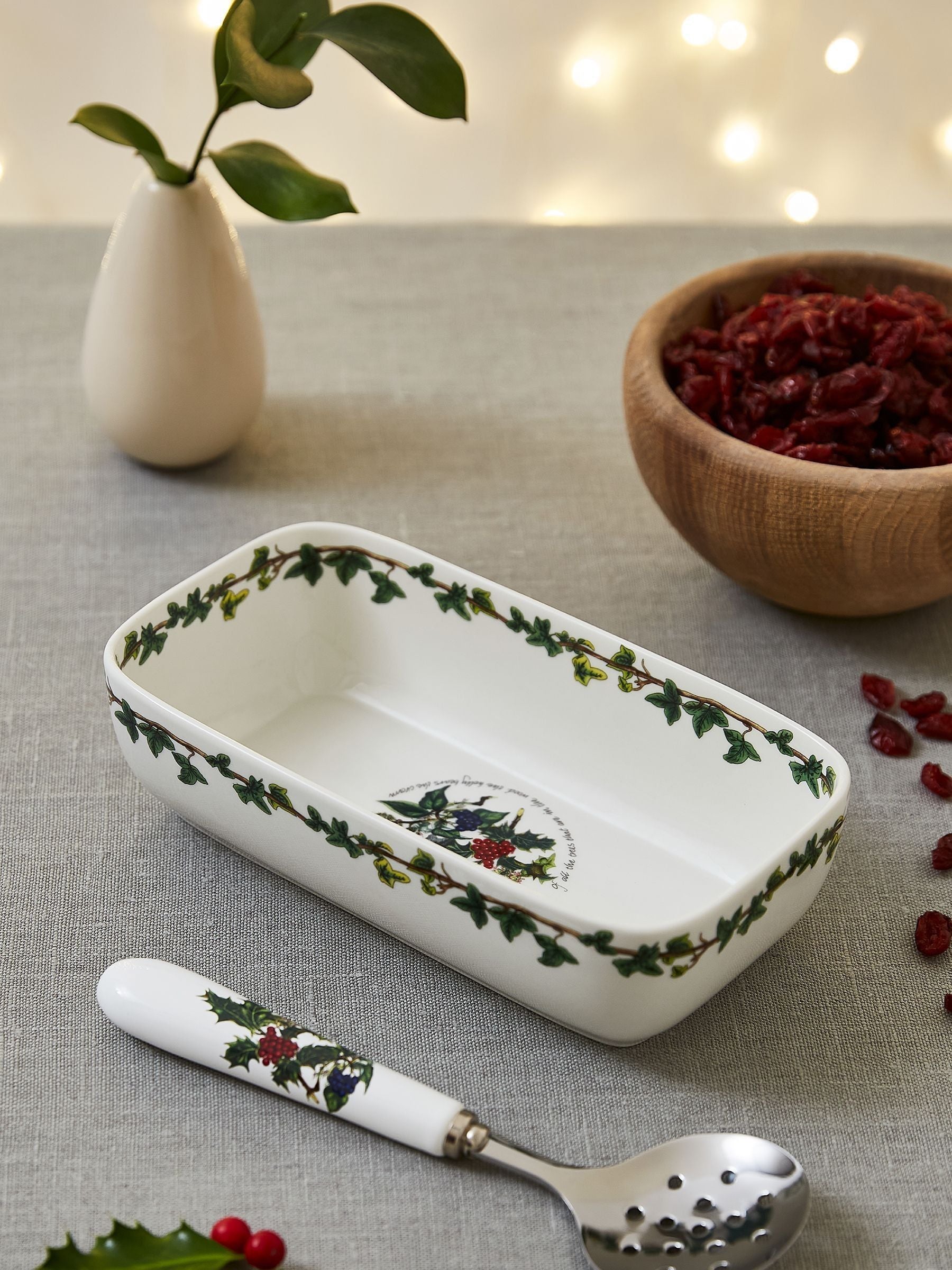 The Holly & The Ivy cranberry dish & slotted spoon from Portmeirion is perfect to serve a variety of sauces, chutneys or jams at the Christmas table. The dish is dishwasher, microwave, freezer and oven safe and the spoon is hand wash.