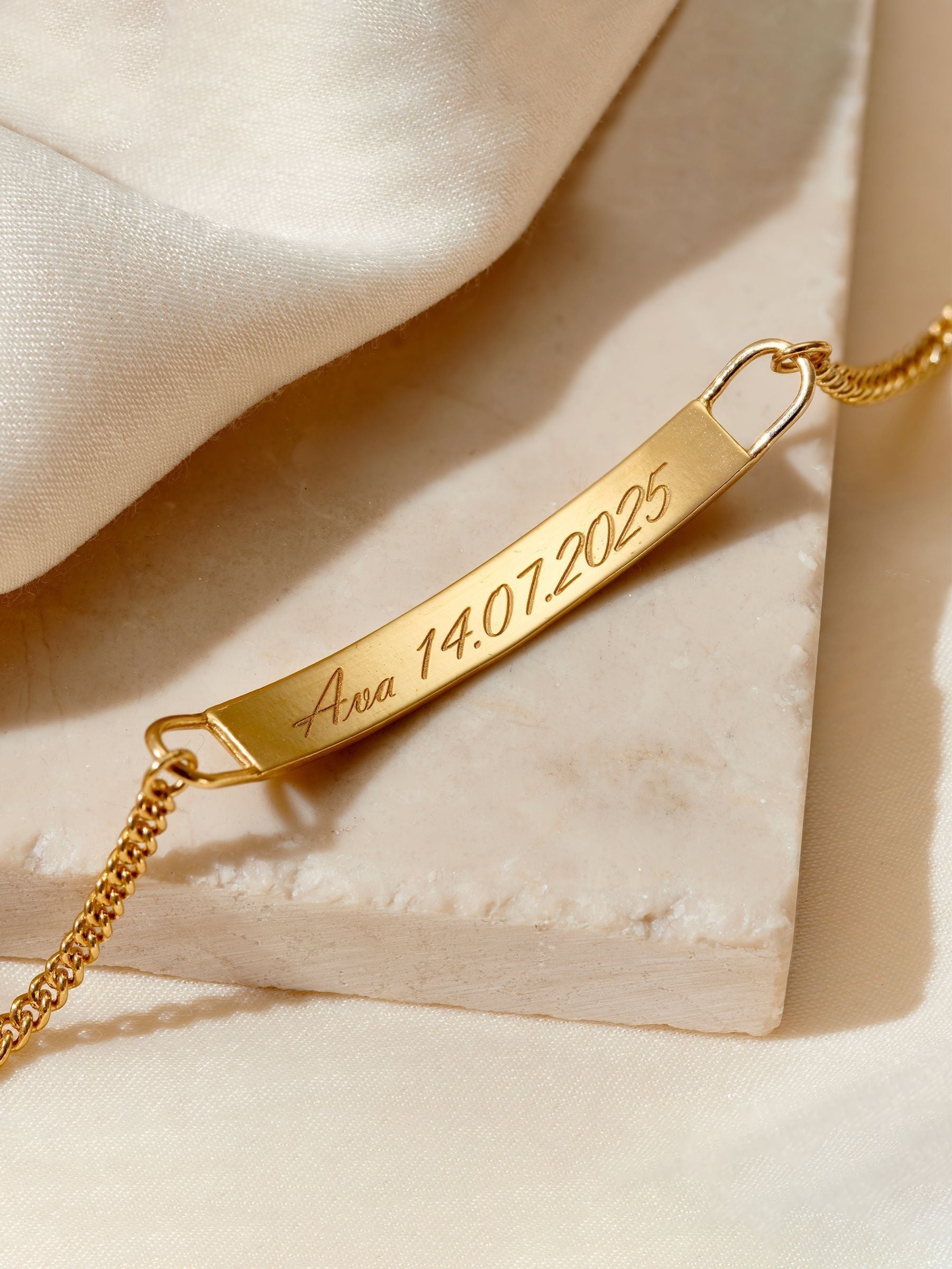 Modern and effortlessly stylish, our 18ct yellow gold plated Sterling Silver Message ID Bracelet features a smooth, curved bar ready to be personalised with your own meaningful words. Whether it’s a name, date, initials or a special phrase, our jewellers will carefully engrave your chosen message to create a piece that’s uniquely yours. A timeless keepsake and a thoughtful gift for birthdays, anniversaries or just because. Made from 18ct yellow gold plated sterling silver. Bracelet measures 18.cm (including bar). Bar measures 5cm length. 0.5cm depth.