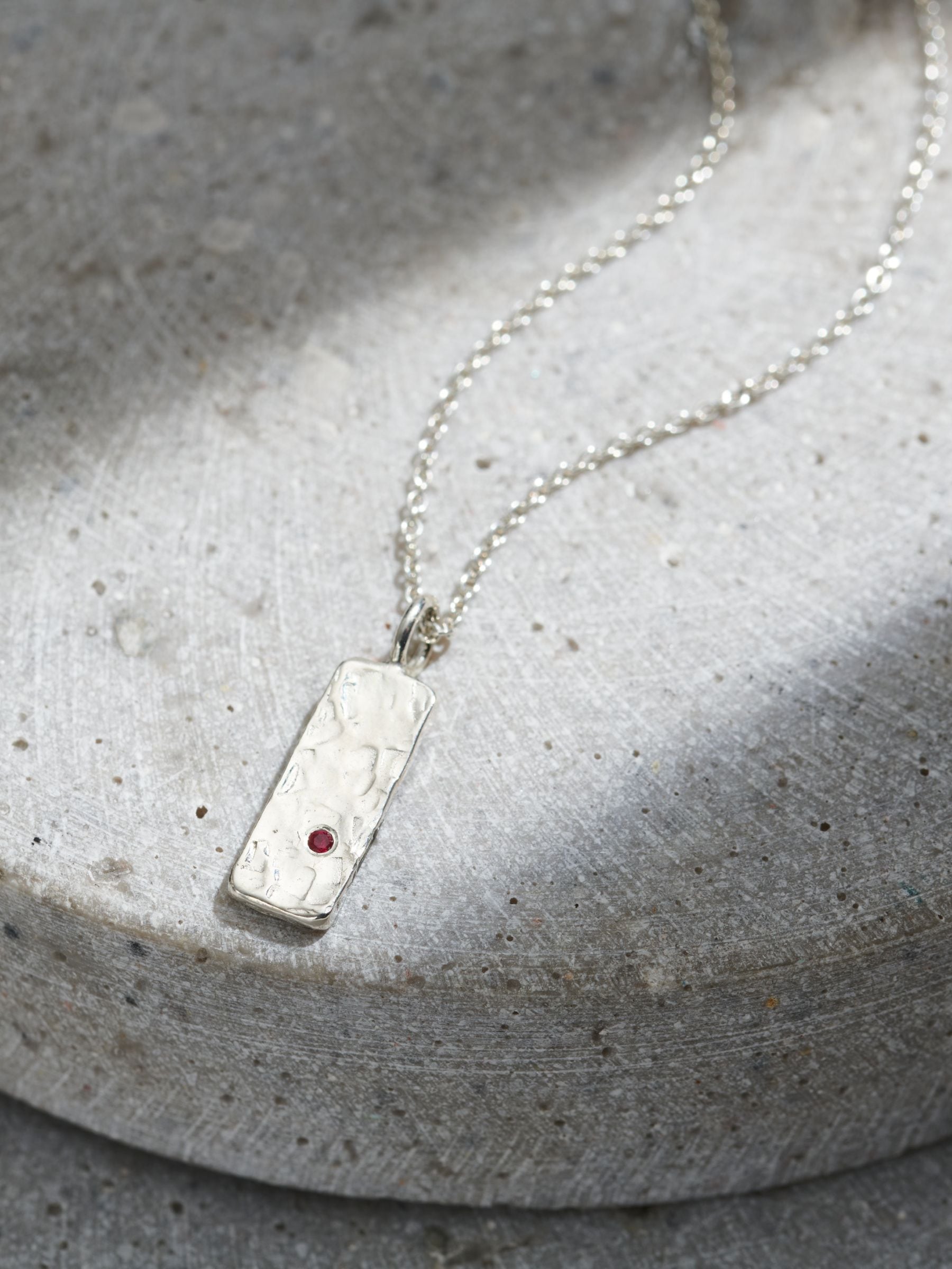 This gorgeous men's silver necklace is handmade in our Brighton workshop. This design features a Sterling Silver tag handset with your chosen birthstone, suspended from a sterling silver chain.