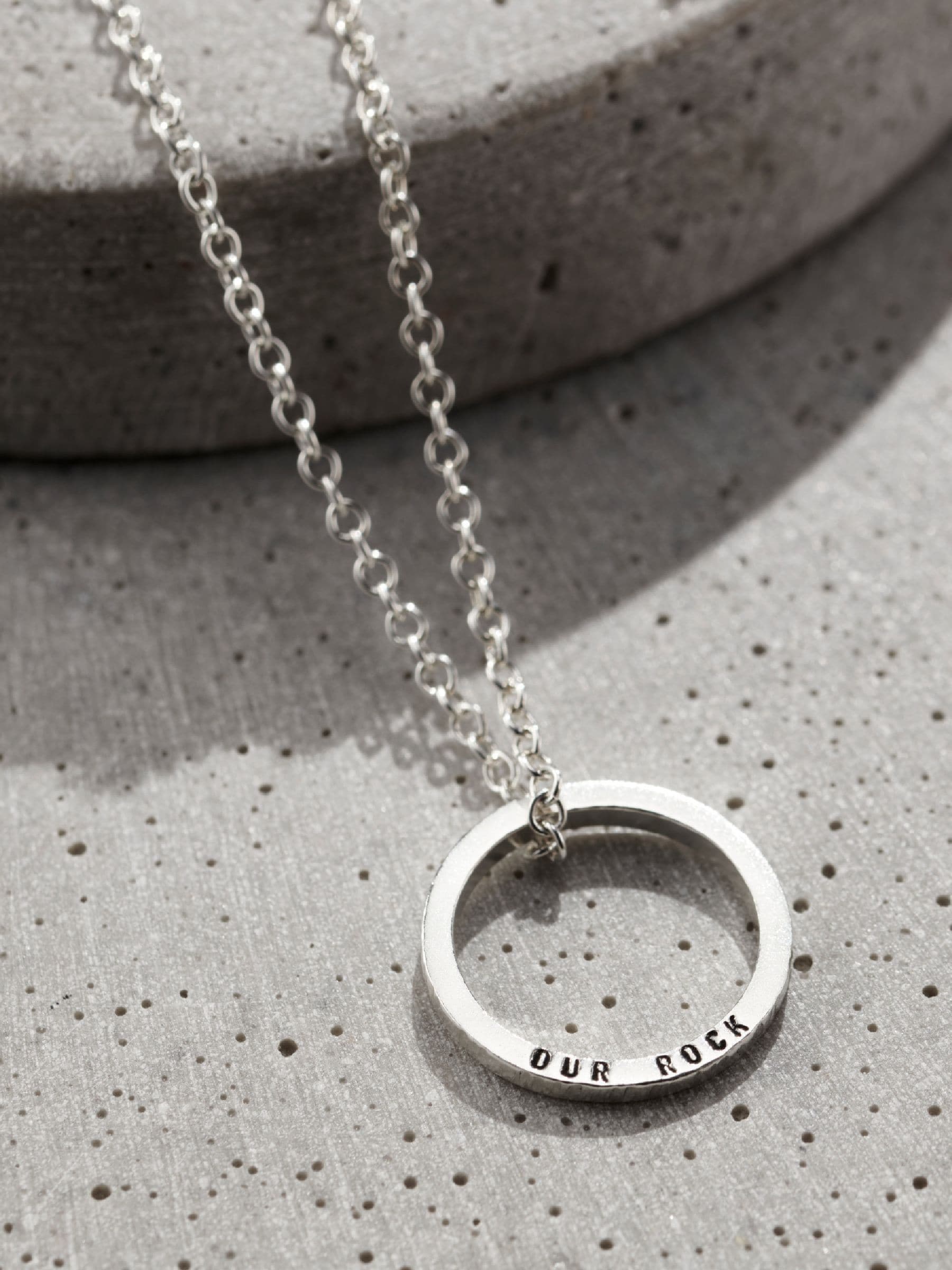 Our Men's Personalised Quote Circle Necklace is handmade from Sterling Silver and finished with a hammered edge making each necklace unique. The circle charm can be personalised by our jewellers with a message, name or date. The perfect gift for yourself or a loved one. Made From 925 Sterling Silver. Circle pendant is 2mm squared and 1.9cm diameter approx. Comes suspended on 20” chain.
