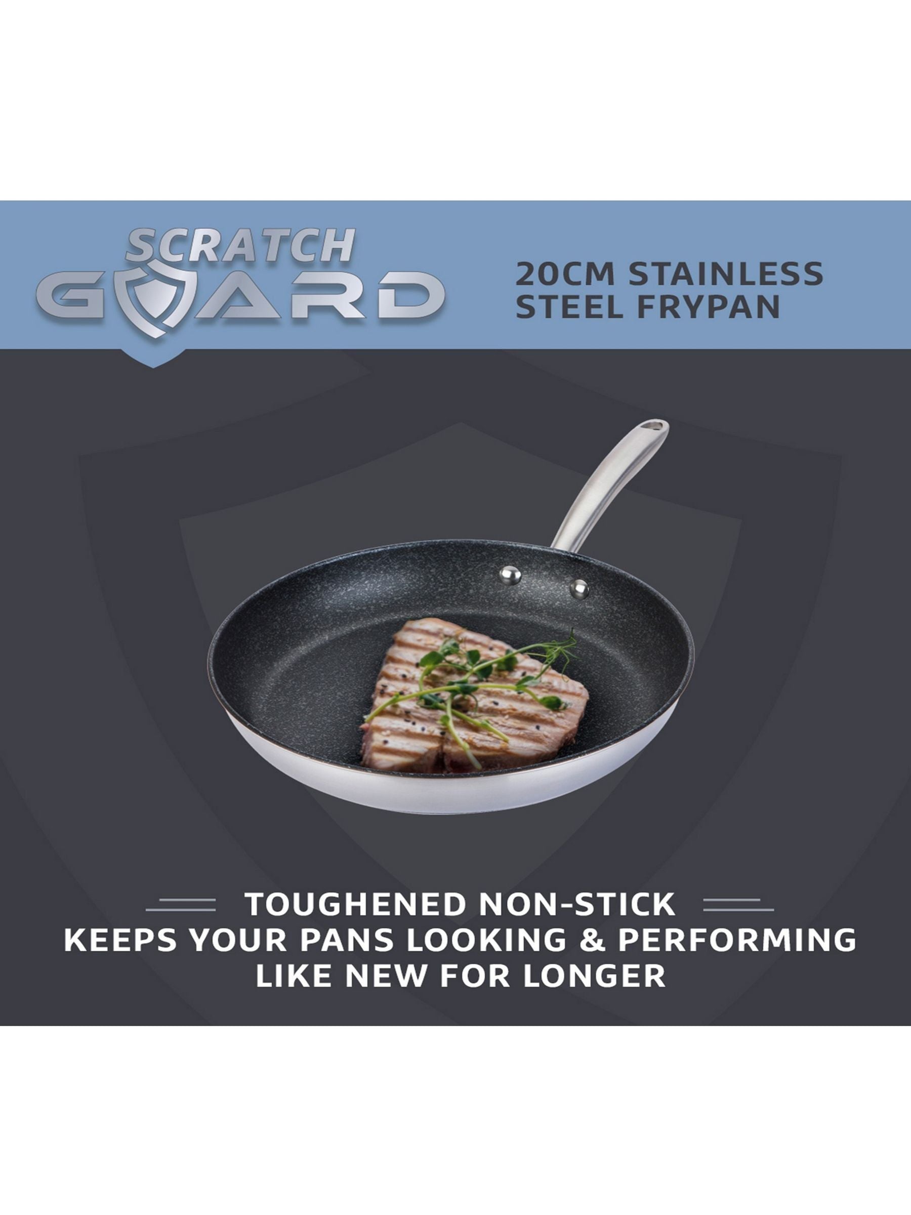 The 25cm Frying Pan from Scratch Guard features a toughened non-stick coating that ensures your pans look and perform like new for longer. Its stone-effect interior comes with advanced anti-scratch technology and a durable three-layer non-stick surface for fuss-free cooking. The triple-layer non-stick coating stays intact inside the pan, preventing flakes for healthier meals. The PFOA-free non-stick interior is paired with a durable, brushed stainless steel exterior, offering exceptional cooking performance. Designed for over 80 years of kitchen expertise, this frying pan offers solid value by addressing the little details that matter most. With a scratch-resistant, triple-layer non-stick interior (PFOA-free) and a high-quality steel base, it ensures fast, even cooking. The solid stainless steel handle is built for comfort, and cleaning is a breeze since the pan is dishwasher safe. It's oven-proof up to 260°C/500°F/Gas Mark 10, and suitable for all hob types, including induction. Backed by a 10-year guarantee, this long-lasting frying pan is built to withstand the test of time. You can choose from sizes: Small (21cm), Medium (25cm), or Large (29cm) to suit your needs.