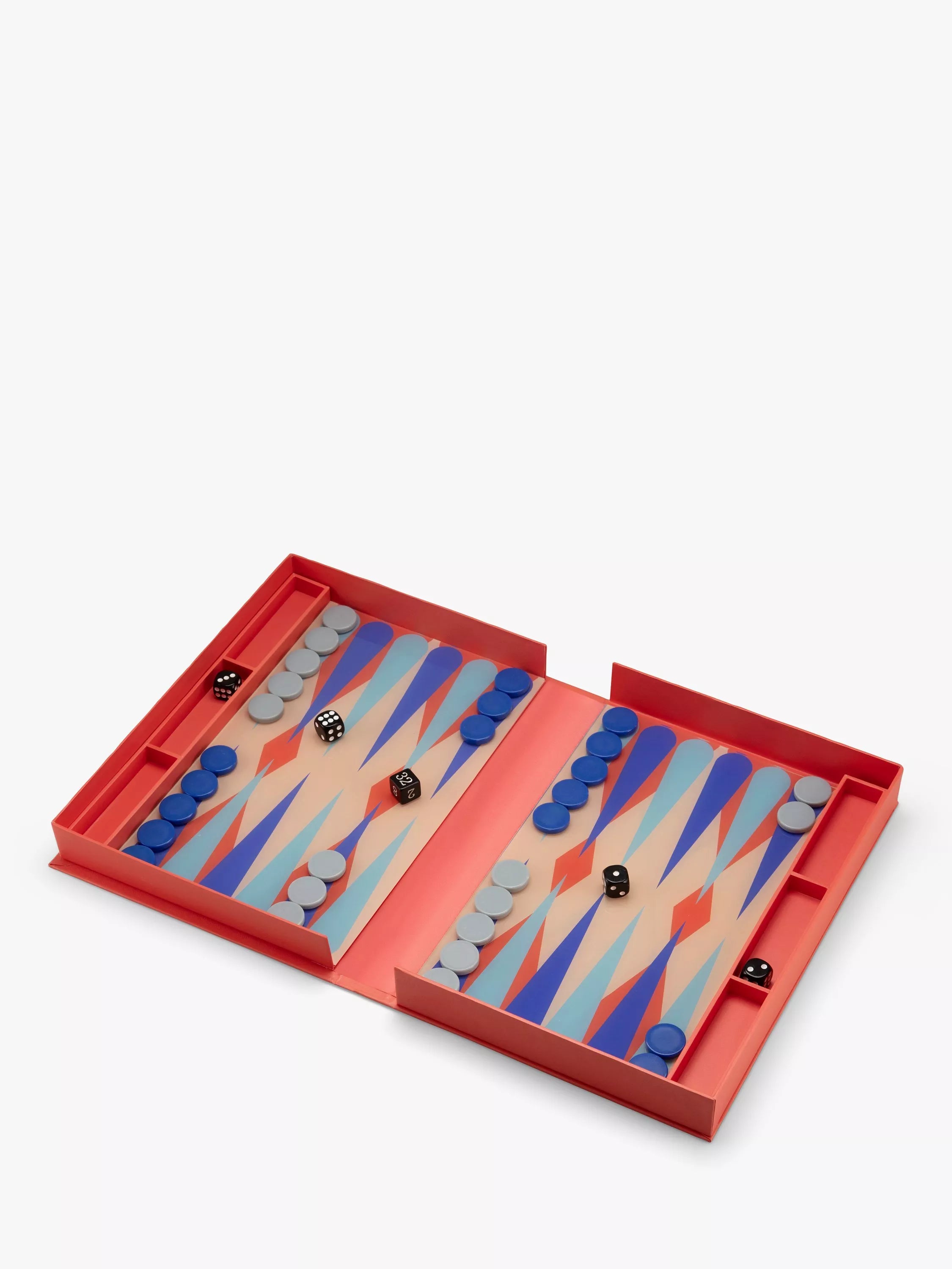 Art of Backgammon features a 20th-century makeover with bold red and blue colours and typography, giving it an artsy impression. The set opens like a book, displaying a sleek, thin layer of acrylic board, inviting you to enjoy hours of strategic play. It also comes with easy-to-read instructions in English, French, and German. Suitable for 2 players and recommended for ages 5 and above.