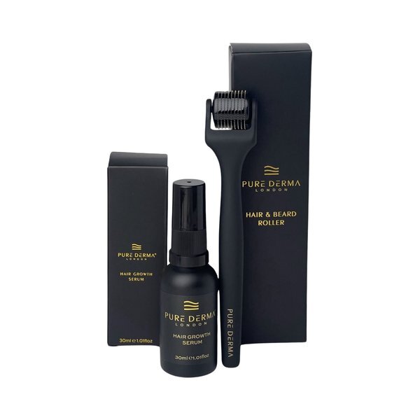 The Pure Derma London 4 in 1 Hair Growth Kit is scientifically formulated to achieve a naturally potent solution designed to boost hair & beard growth, combing the power of microneedling & with the scientifically formulated 4 in 1 Hair Growth Serum. The use of microneedling to stimulate hair follicles is a clinically proven technique, it uses the magic within your skin to naturally kick start regeneration and repair, and enhancing blood flow and promoting robust growth for a thicker head of hair and less patchy beard. The scientifically crafted 4 in 1 Hair Growth Serum is formulated to target dry, damaged and thinning hair using a potent combination of caffeine, biotin, radish root and phospholipids to promote natural healthy hair and beard growth, reduce thinning, enhance strength and invigorate the hair follicle. Using the combination of the premium Hair Beard Derma Roller featuring 540 medical grade ultra-fine 0.5mm titanium microneedles with the 4 in 1 Hair Growth Serum, ensures a powerful natural stimulation for your hair and beard follicles, fighting hair loss and thinning hair. The 4 in 1 Hair Growth Serum works for all hair and beard types and helps to reduce itchiness, frizzy hair, giving that healthy glossy look. Say goodbye to thinning hair and unleash the potential of your hair and beard growth with every drop, strengthen each hair strand from root to tip. The power of our scientifically formulated 4 in 1 Hair Growth Serum Biotin, also known as vitamin B7, stimulates keratin production in hair and can increase the rate of follicle growth. Biotin's involvement in protein synthesis and keratin production allows this vitamin to contribute to healthy hair growth. Caffeine, aids in hair growth straight from the root of the hair shaft. It targets the hormone commonly known as 'DHT' which causes hair loss. DHT can prevent vitamins, proteins and minerals from helping hair follicles to grow. Radish Root Ferment Filtrate, clears free radicals from the scalp and provides phytonutrients for a healthier scalp. The reduction in free radicals delays the aging process of cells, therefore strengthening the cells and leading to healthier hair roots. Phospholipids, help support healthy hair and beard follicles, healthy scalp fertility for hair growth and healthy hair. Sodium Hyaluronate, helps replace the scalps natural Hyaluronic Acid and locks in much needed moisture on the scalp as well as throughout the hair, reducing levels of hair frizz. Our 4 in 1 Hair Growth Serum is produced in the UK, cruelty free and vegan, meaning you can buy and use knowing it's been produced ethically, without harm to the environment. Help reverse hair loss and experience the transformation to thicker, healthier hair with the Pure Derma London 4 in 1 Hair Growth Kit.