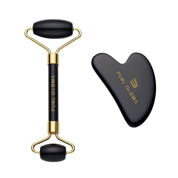 This Pure Derma London set features a Black Obsidian Gua Sha and Face Roller combination. These precisely crafted instruments are designed to effectively relieve facial tension and increase circulation across the skin's surface. Regular use may assist in supporting natural lymphatic drainage, contributing to a noticeably more radiant complexion.
