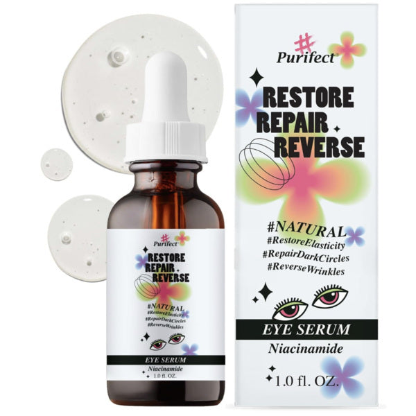 [RESTORE ELASTICITY & REPAIR DARK CIRCLES & REVERSE WRINKLES] Niacinamide boosts collagen production and visibly improves skin elasticity. Niacinamide can lighten dark circles under-eyeand revive the delicate skin around your eyes. It can also visibly smooth fine lines and wrinkles, giving you a refreshed and rejuvenated look. [KEY INGREDIENTS] include Niacinamide that works well with Vitamin C to lighten dark circles under-eye as well as plump and hydrate the area, and Vitamin E that contains anti-aging properties to freshen your under-eye for rejuvenated appearance. [DAY & NIGHT EYE SERUM] This serum can be used for under-eye area for both day and night routines. For best results, use everyday morning and night. [FOR CONSCIOUS CONSUMERS] If you like natural products with no harsh chemicals, this is the perfect eye serum for you. This product does not contain alcohol, synthetic colors, parabens, sulfates, phthalates, etc. or anything you do not want near your skin. [SKINCARE INNOVATION] All of Purifect products are dermatologist-tested, made in U.S.A., suitable for all skin types, Leaping Bunny Certified for cruelty-free, NaVOBA certified for a veteran-owned organization, and formulated without any harsh chemicals.