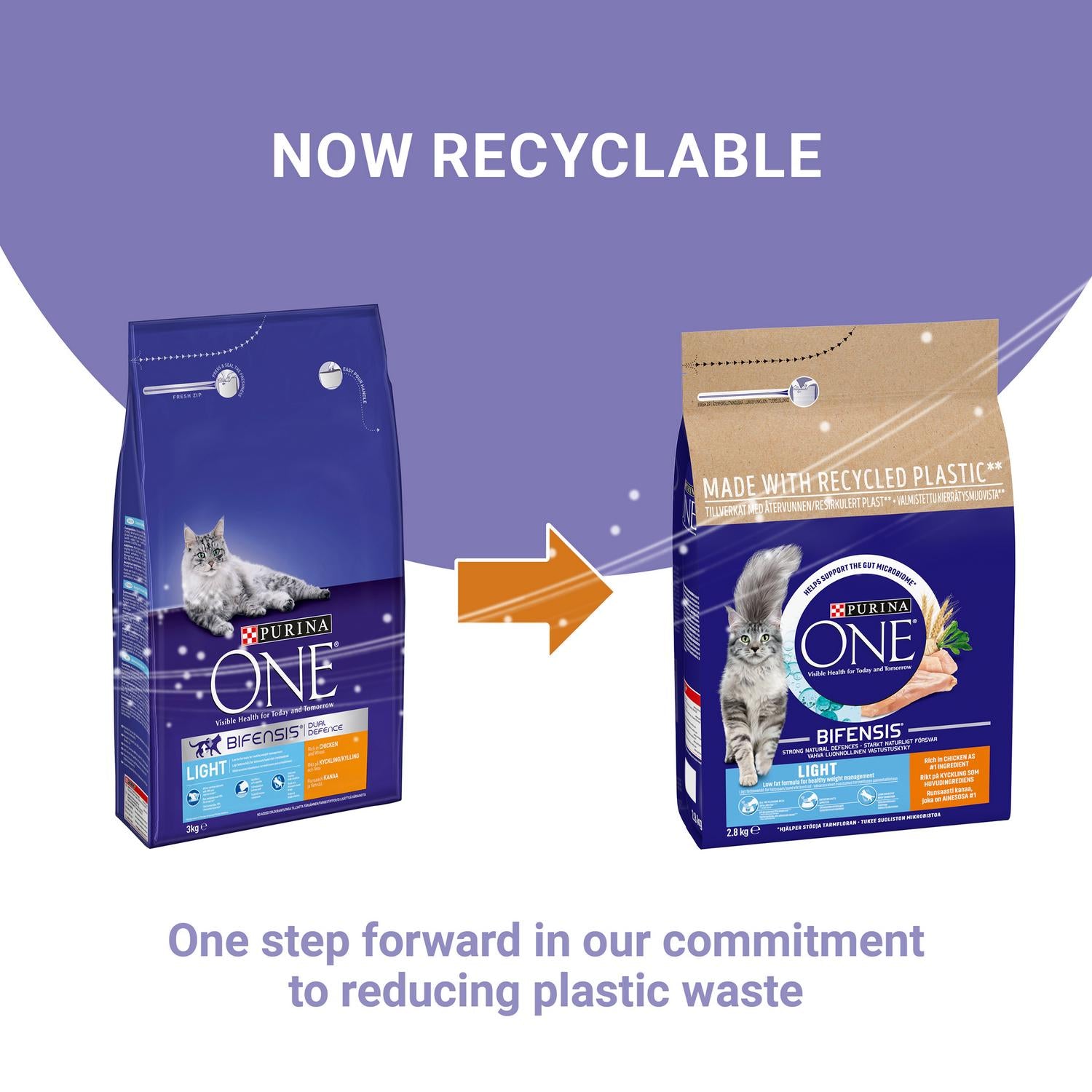 VISIBLE HEALTH FOR TODAY AND TOMORROW PURINA ONE® Light is specifically designed to help your cat to reach and maintain her healthy weight without compromising on taste. Having a balanced gut microbiome is essential for the good health of your cat. It has a direct impact on their natural defences. The microbiome is an ecosystem containing trillions of microorganisms that live in the gut and are unique to each cat. The balance of microorganisms is important to make positive effect on your cat’s digestive health, natural defences, and overall well-being. PURINA ONE® BIFENSIS® is nutritional formula with a beneficial functional bacteria: Lactobacillus, scientifically proven to strengthen your cat’s natural defences from the inside out and helps protect a healthy gut microbiome. Purina ONE® BIFENSIS® contains high-quality ingredients, including prebiotic: chicory, which nurtures good bacteria in the gut to improve your cat’s gut microbiome for maintaining your cat in a good health. From a healthy digestion and strong natural defences to a shiny coat you can see visible results on your cat’s health today and tomorrow. Scientifically proven to strengthen your cat’s natural defences thanks to lactobacillus - specific functional bacteria Improves gut microbiome balance thanks to chicory, a prebiotic 30% less fat for healthy weight management* *vs Adult recipe All the pleasure to satisfy cat’s appetite thanks to high quality and tasty ingredients Appropriate protein content to help promote lean & healthy body condition Helps maintain a healthy urinary tract