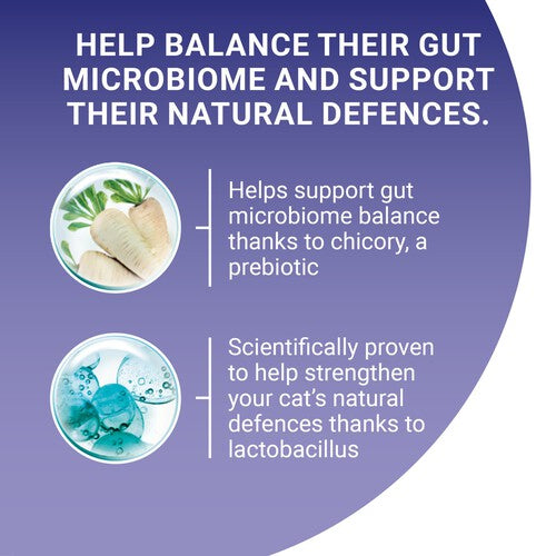 Having a balanced gut microbiome is essential for the good health of your cat. It has a direct impact on their natural defences. The microbiome is an ecosystem containing trillions of microorganisms that live in the gut and are unique to each cat. The balance of microorganisms is important to make positive effect on your cat’s digestive health, natural defences, and overall well-being.