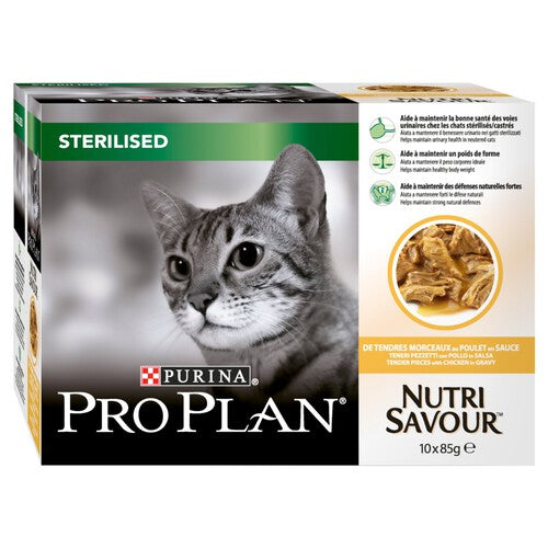 Read MoreIf you have a cat that has been neutered and enjoys wet food, try Pro Plan NutriSavour Sterilised Adult. It contains all the nutrients your cat needs for day-to-day vitality, long-term health and help maintain strong natural defences. With Chicken as No. 1 ingredient this great tasting recipe is adapted to help your cat maintain a healthy body weight, support their urinary health whilst living every moment to the fullest. A complete wet food scientifically formulated for sterilised or neutered Adult Cats 1+ to help maintain a healthy body weight It is specially formulated to help maintain urinary health in neutered Cats and help support healthy natural defences. Made with protein-rich tender chunks of chicken in a delicious gravy for a tasty Wet recipe that Cats love to eat